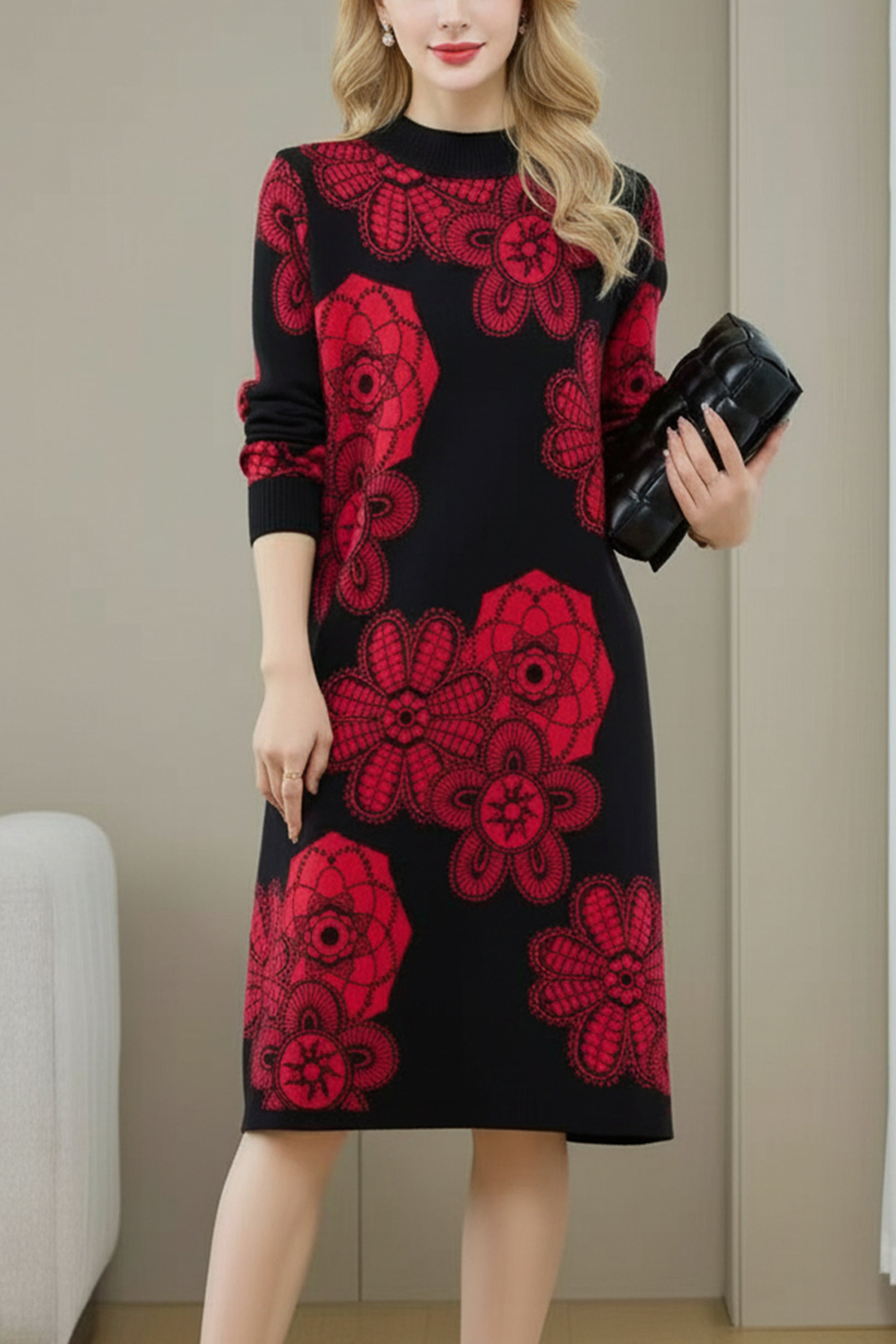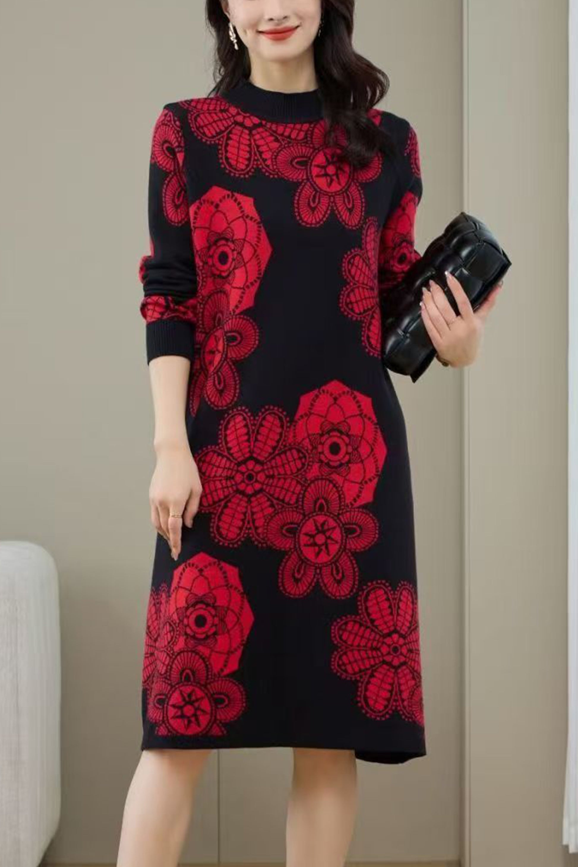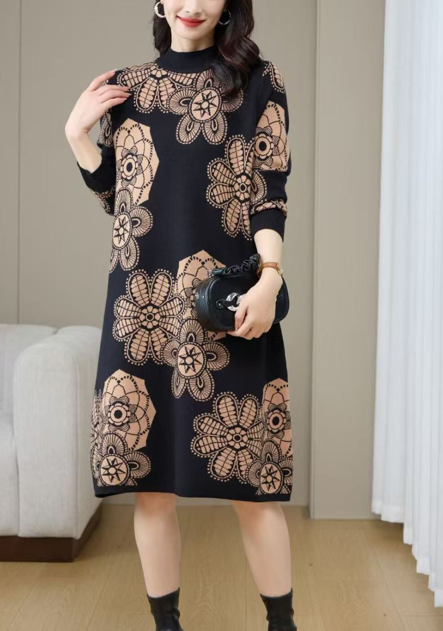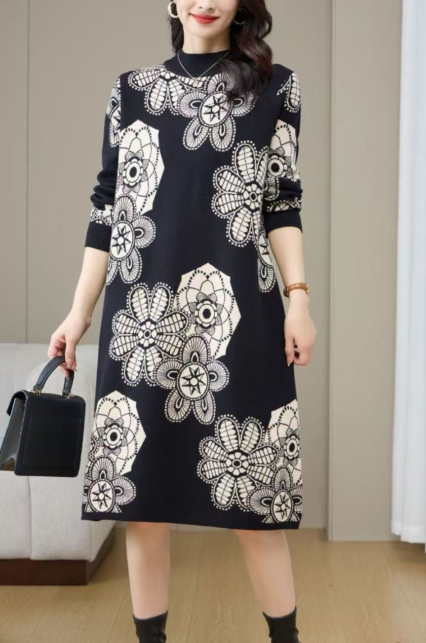 Women's Turtleneck Print Pullover Sweater Midi Dress