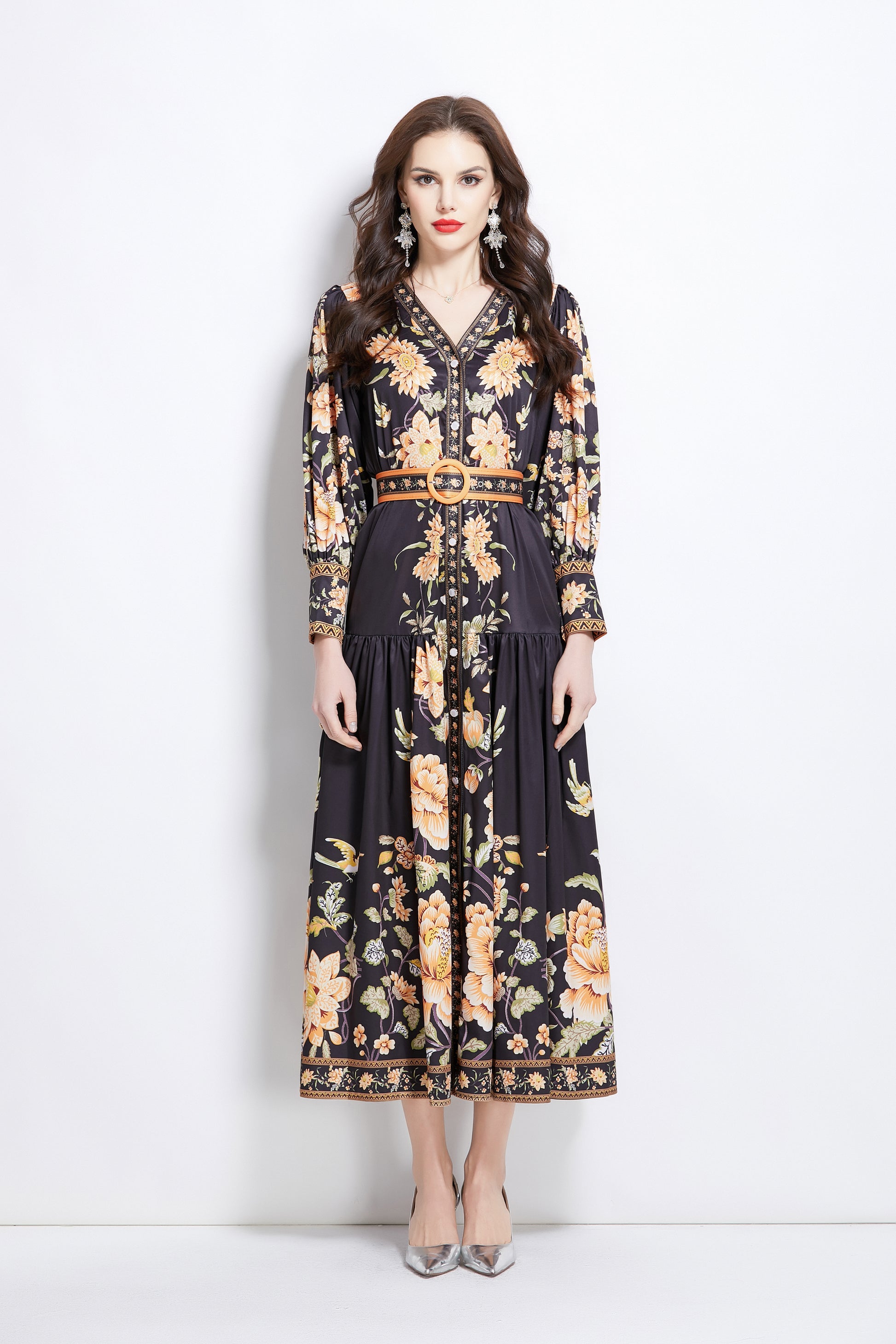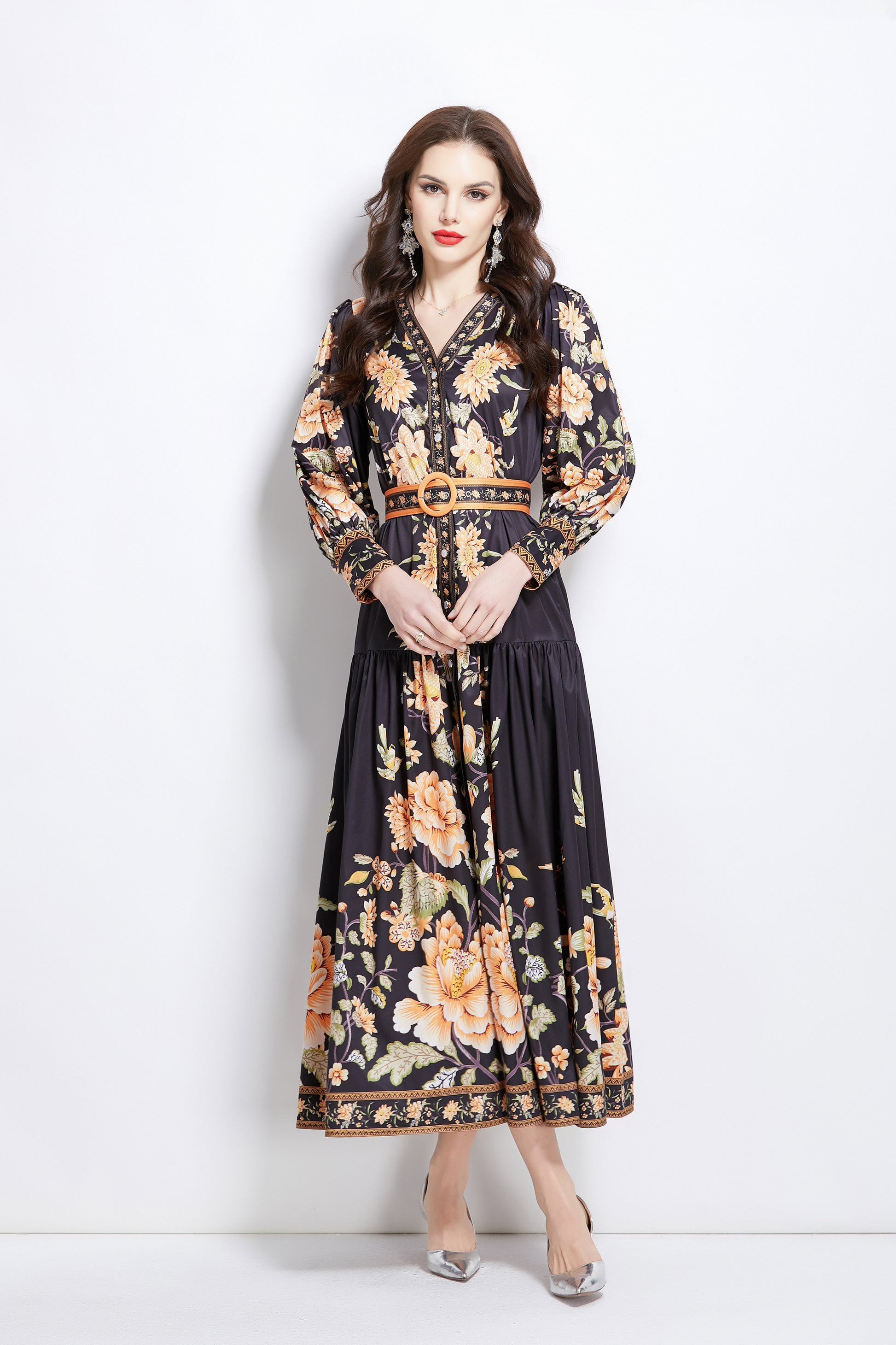 - Features: V-neck design, lantern long sleeves, delicate print, front buttons, pleats, with belt,maxi length.