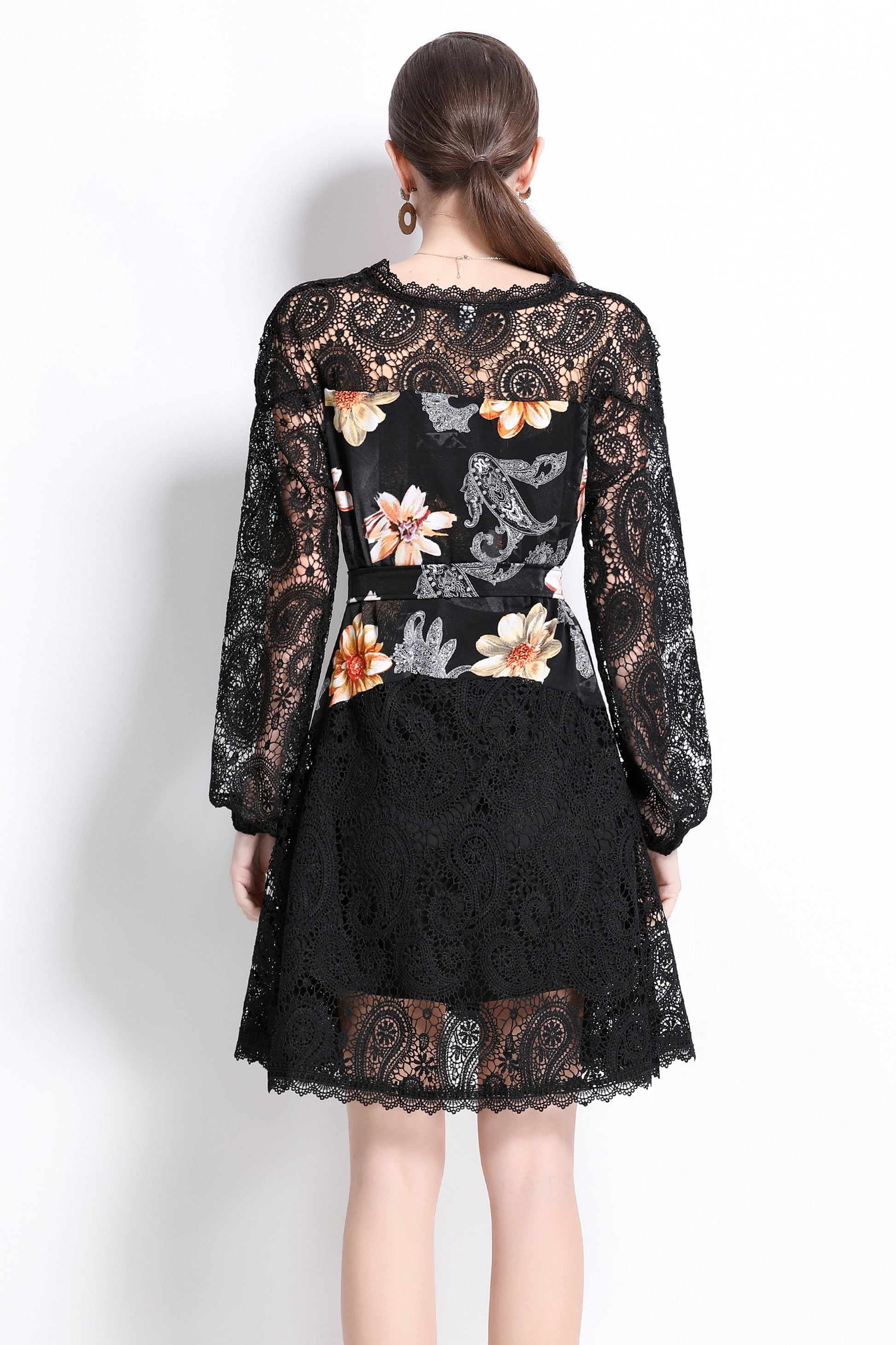 Women's V-Neck Lace Hollow Floral Print Mini Dress