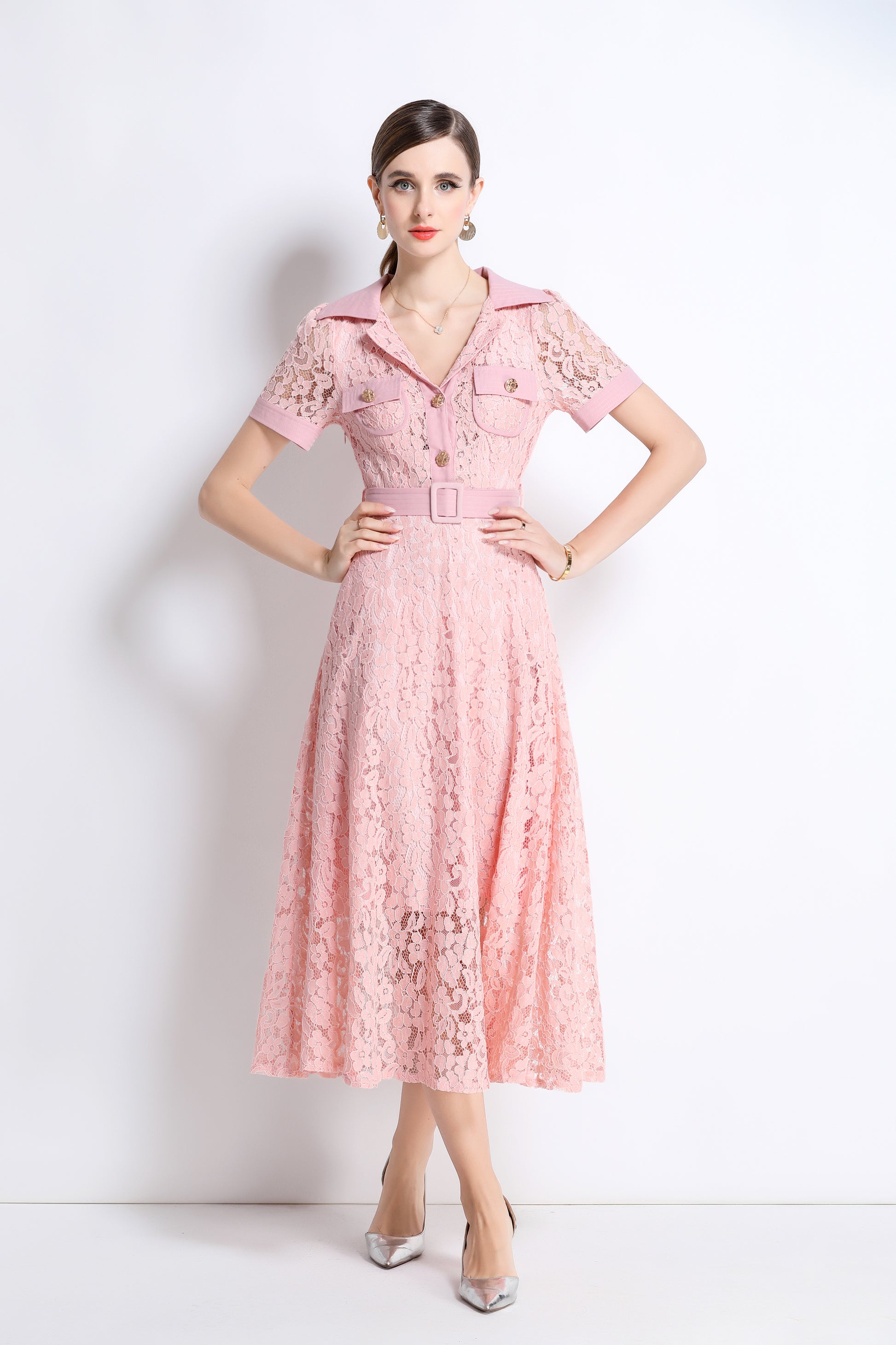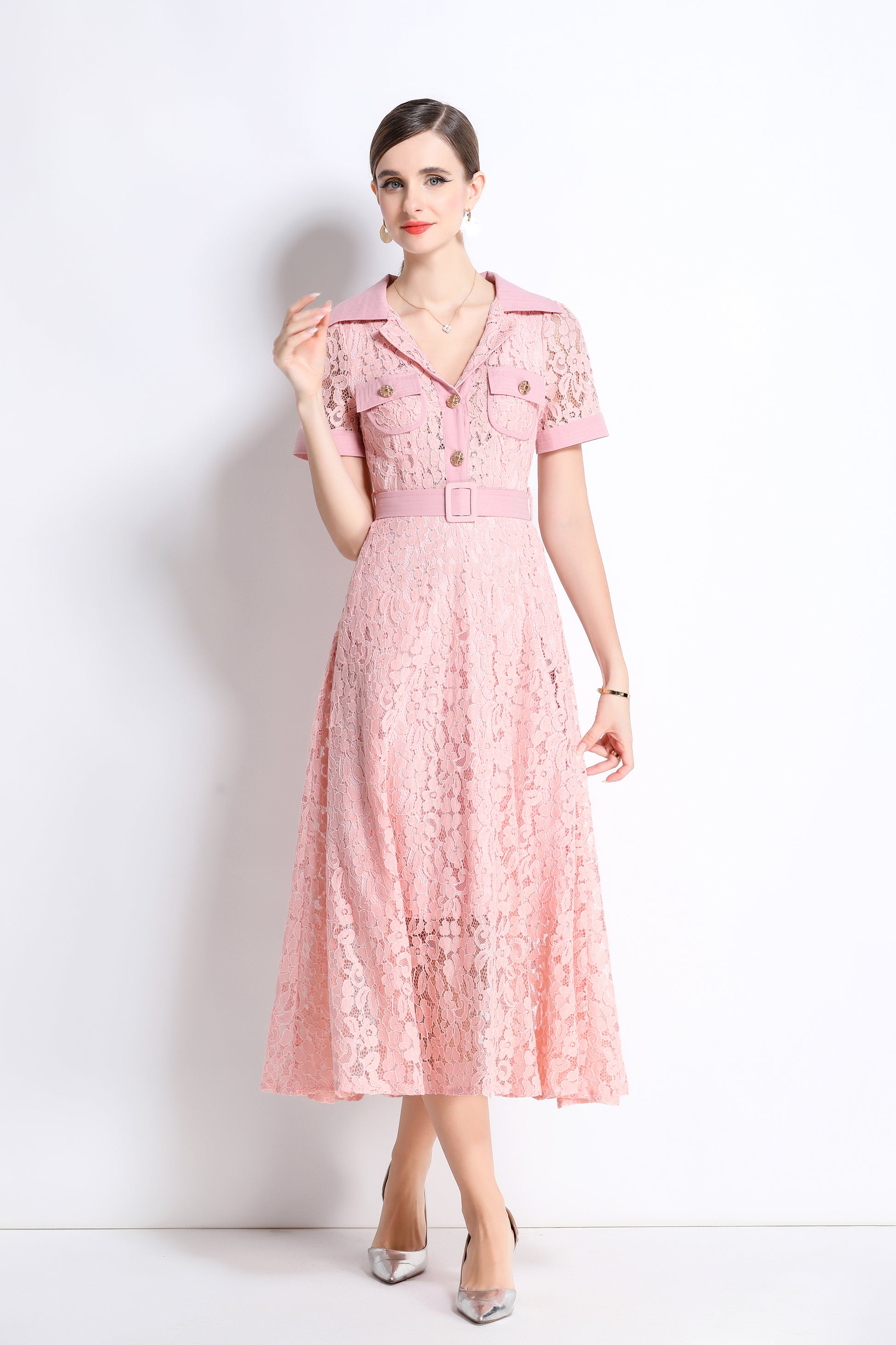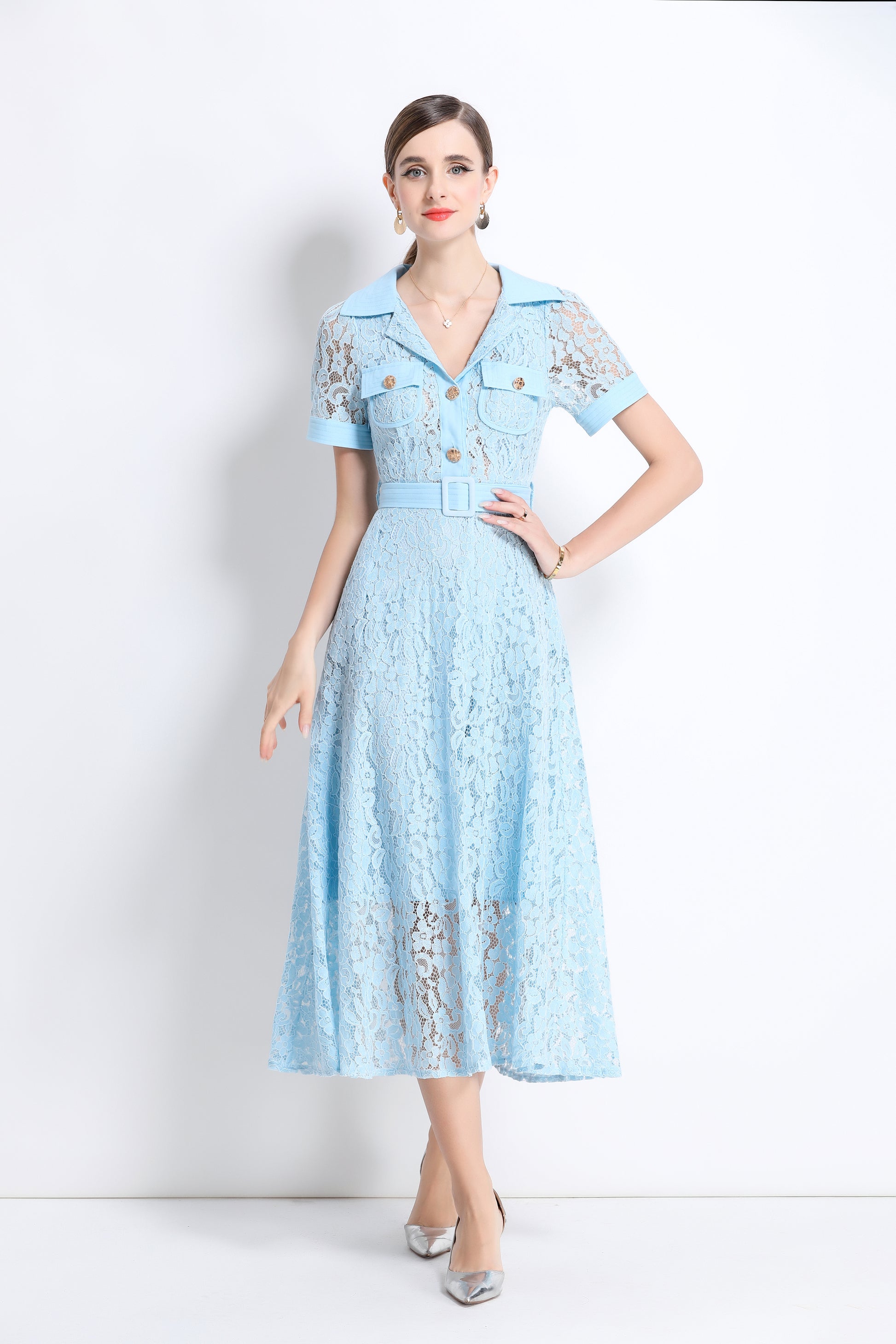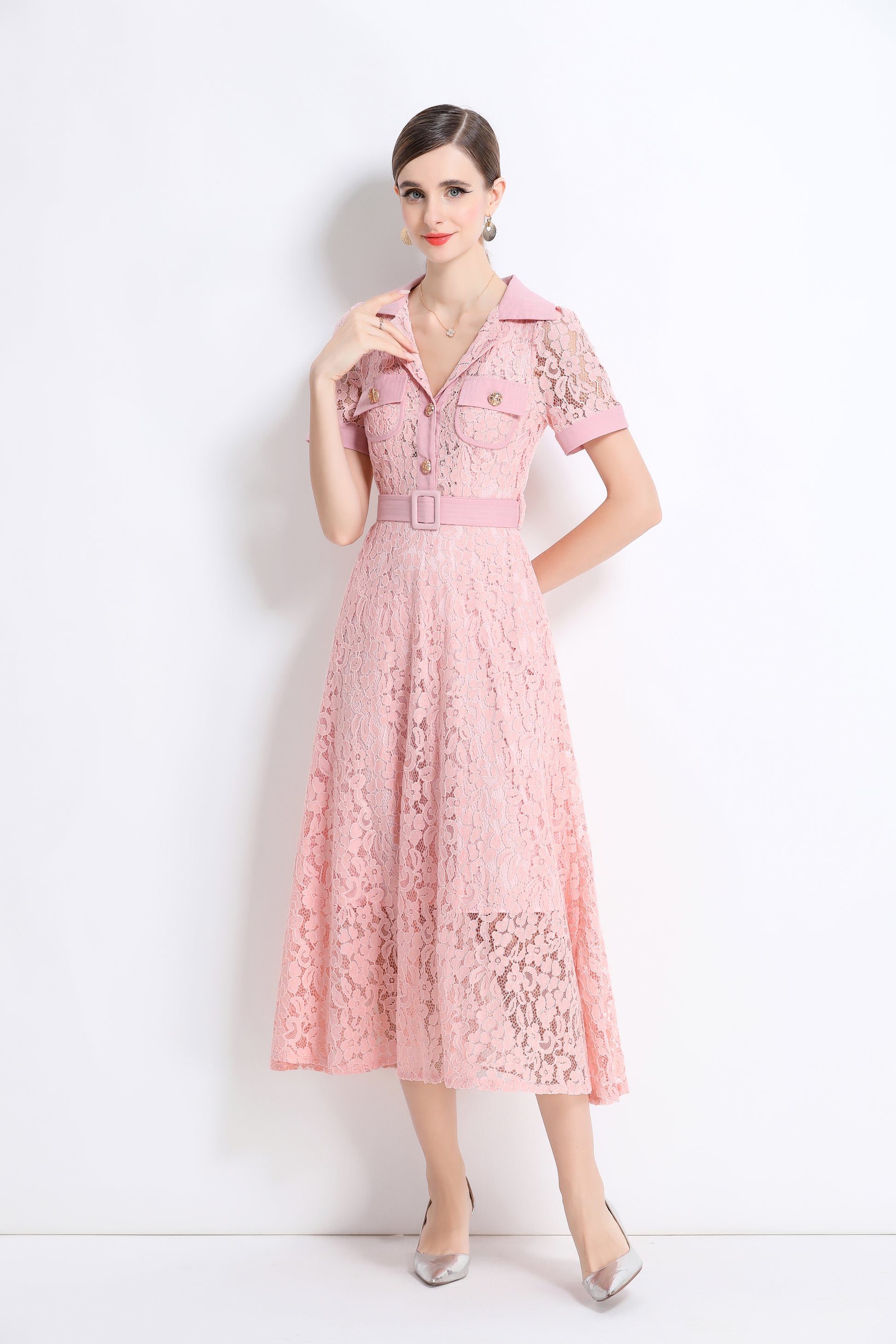 Features: lapel v neck, short sleeves, front buttons, with a belt, lace, lining, pocket decoration.