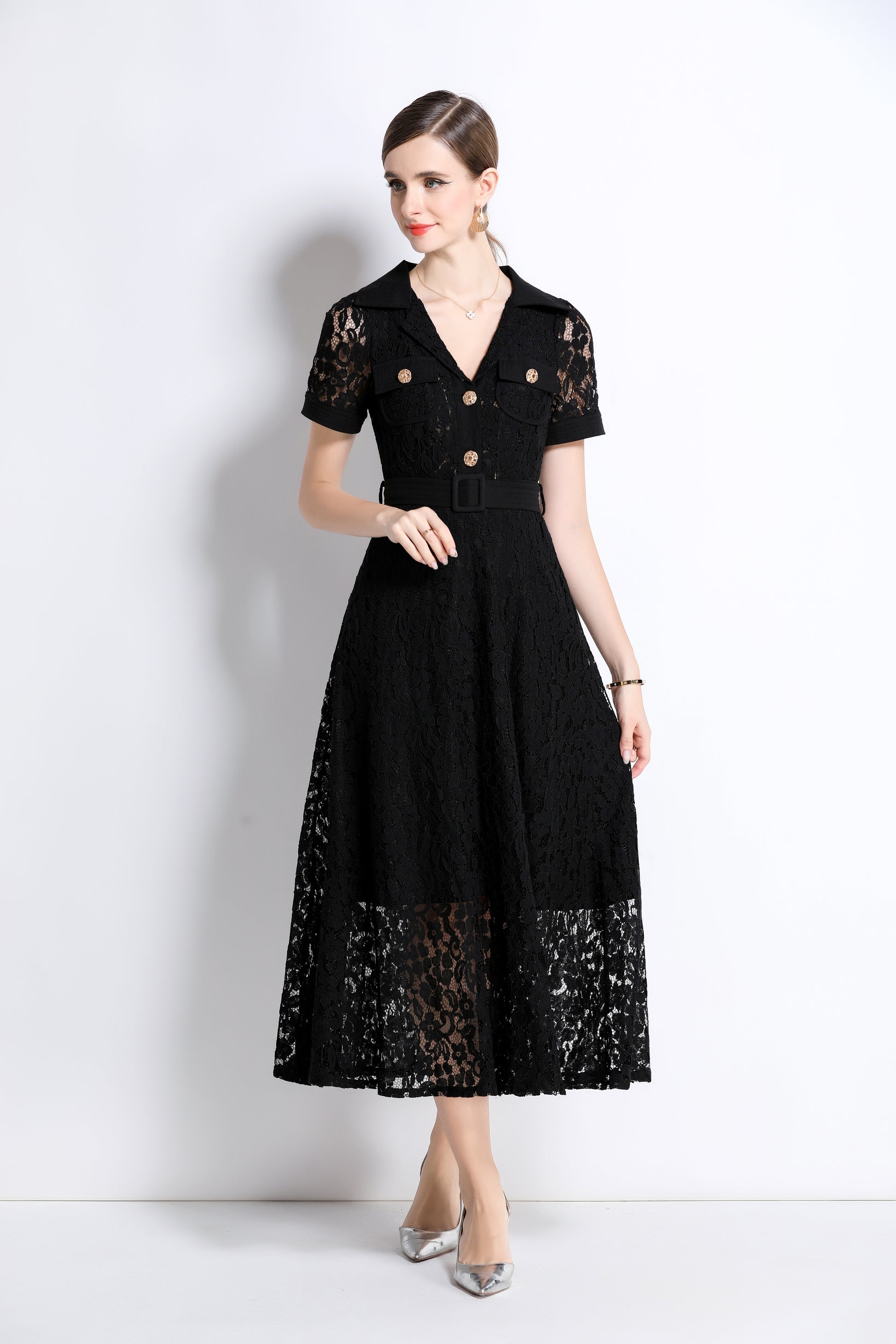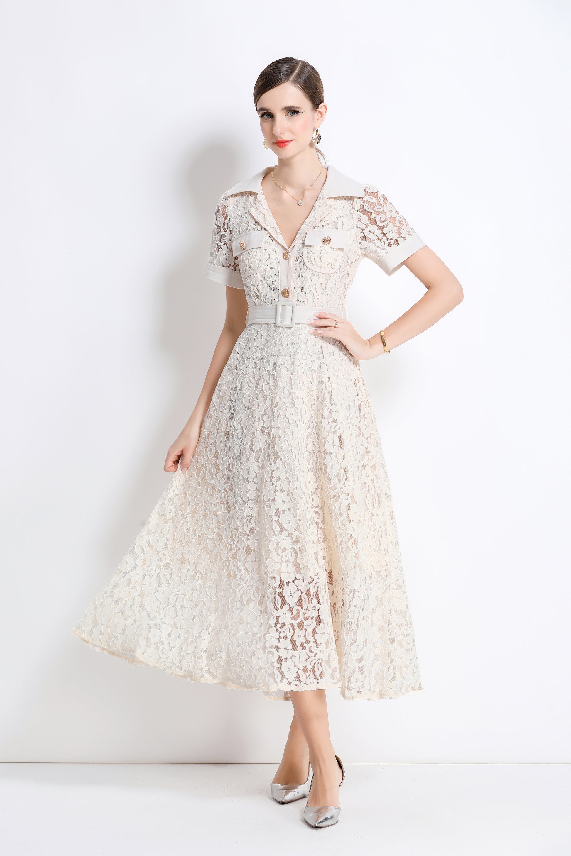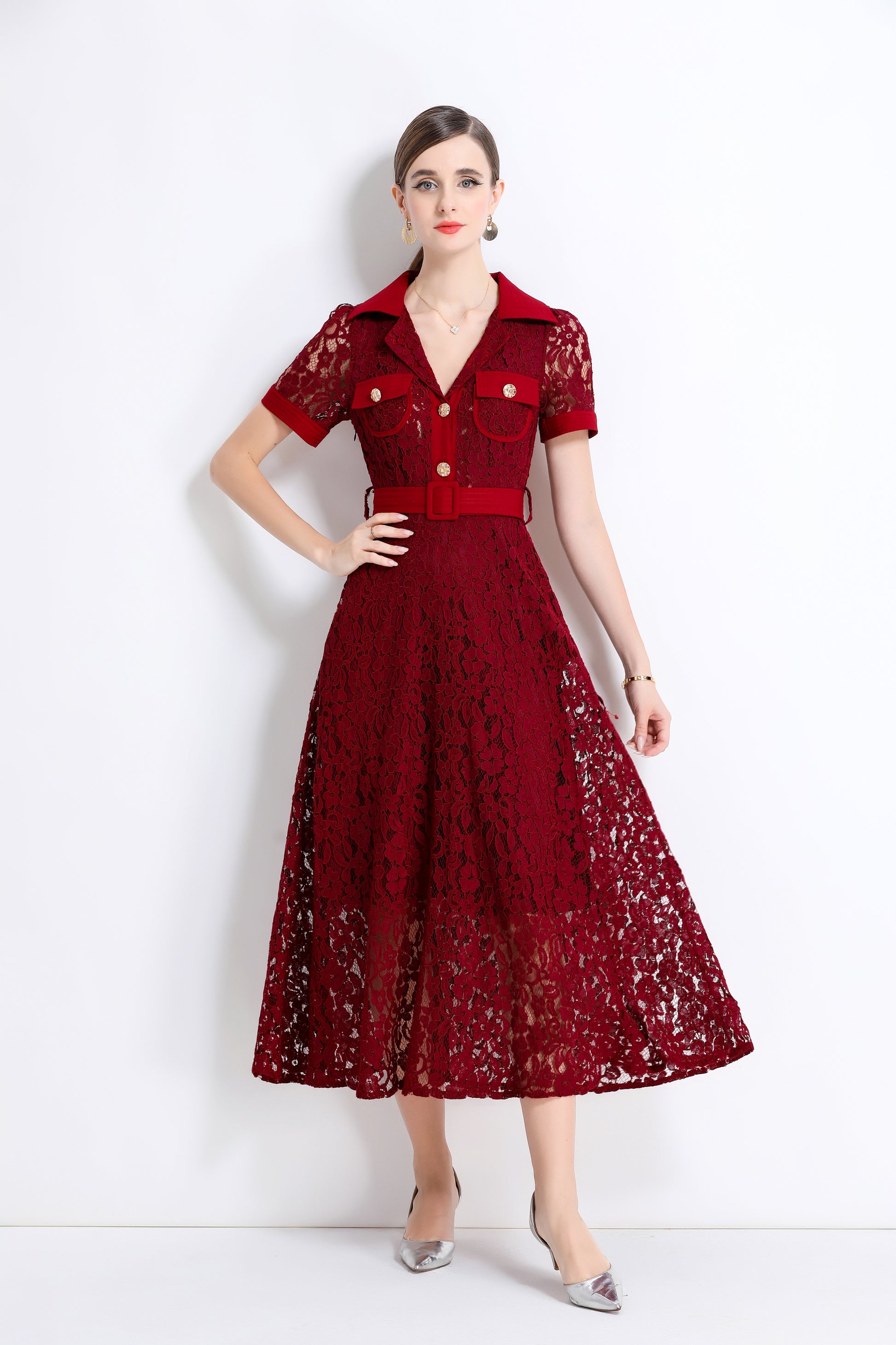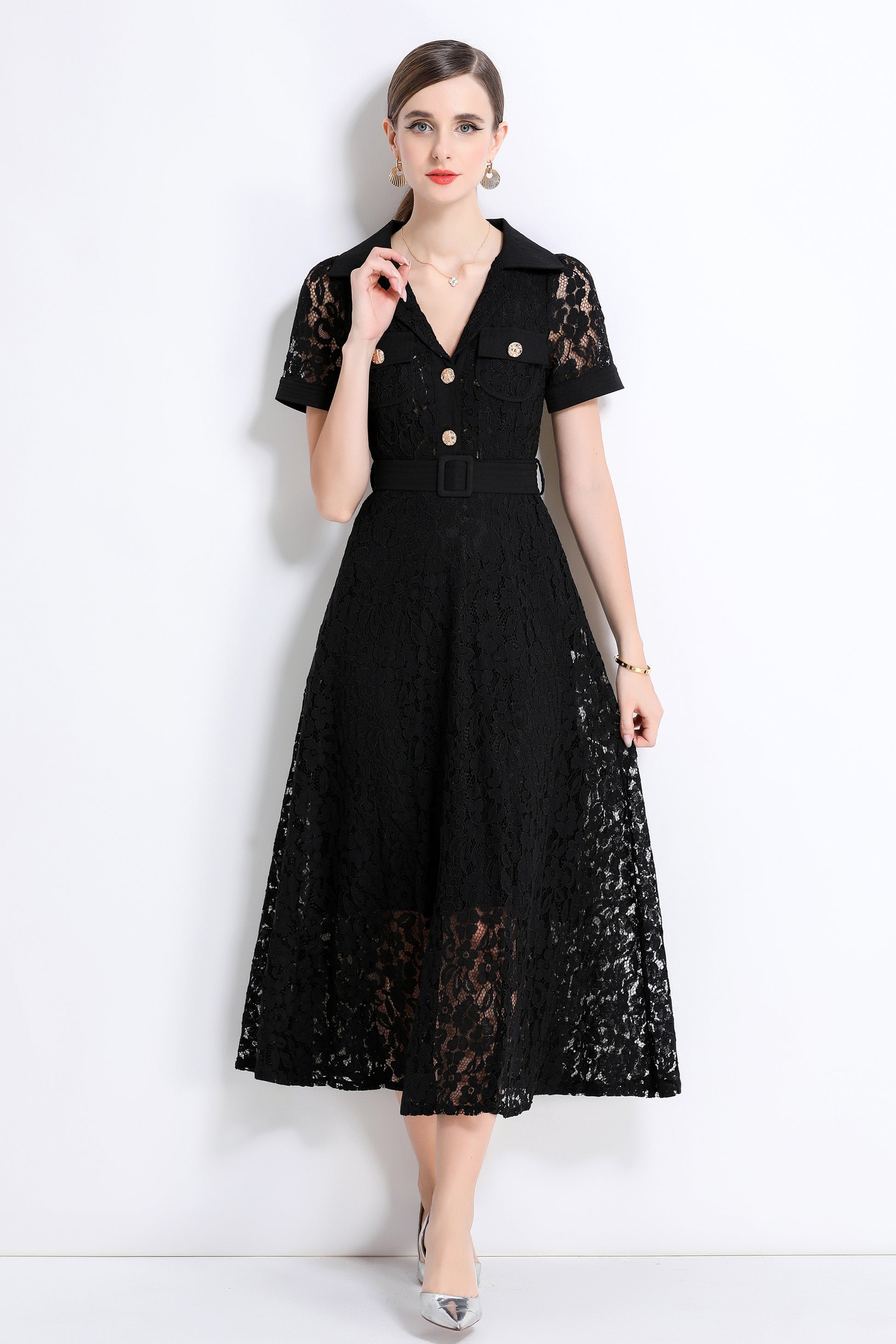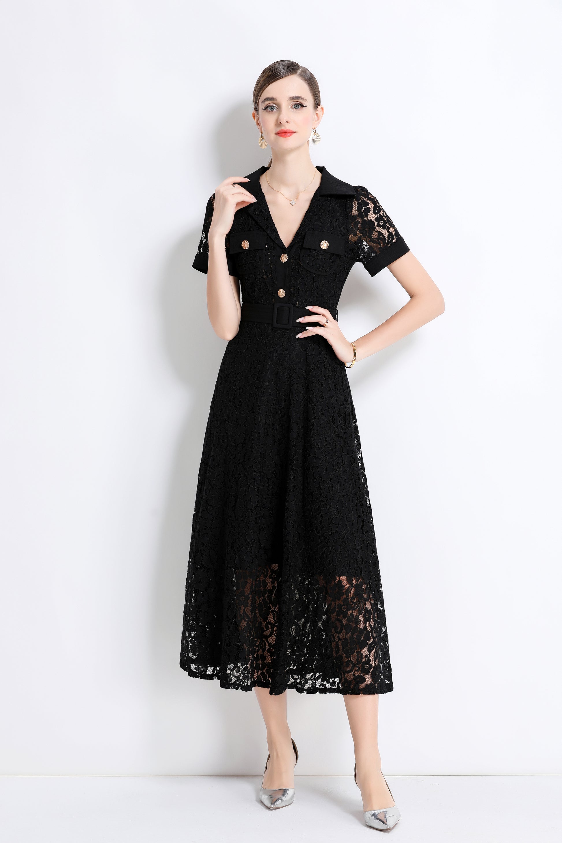 Features: lapel v neck, short sleeves, front buttons, with a belt, lace, lining, pocket decoration.