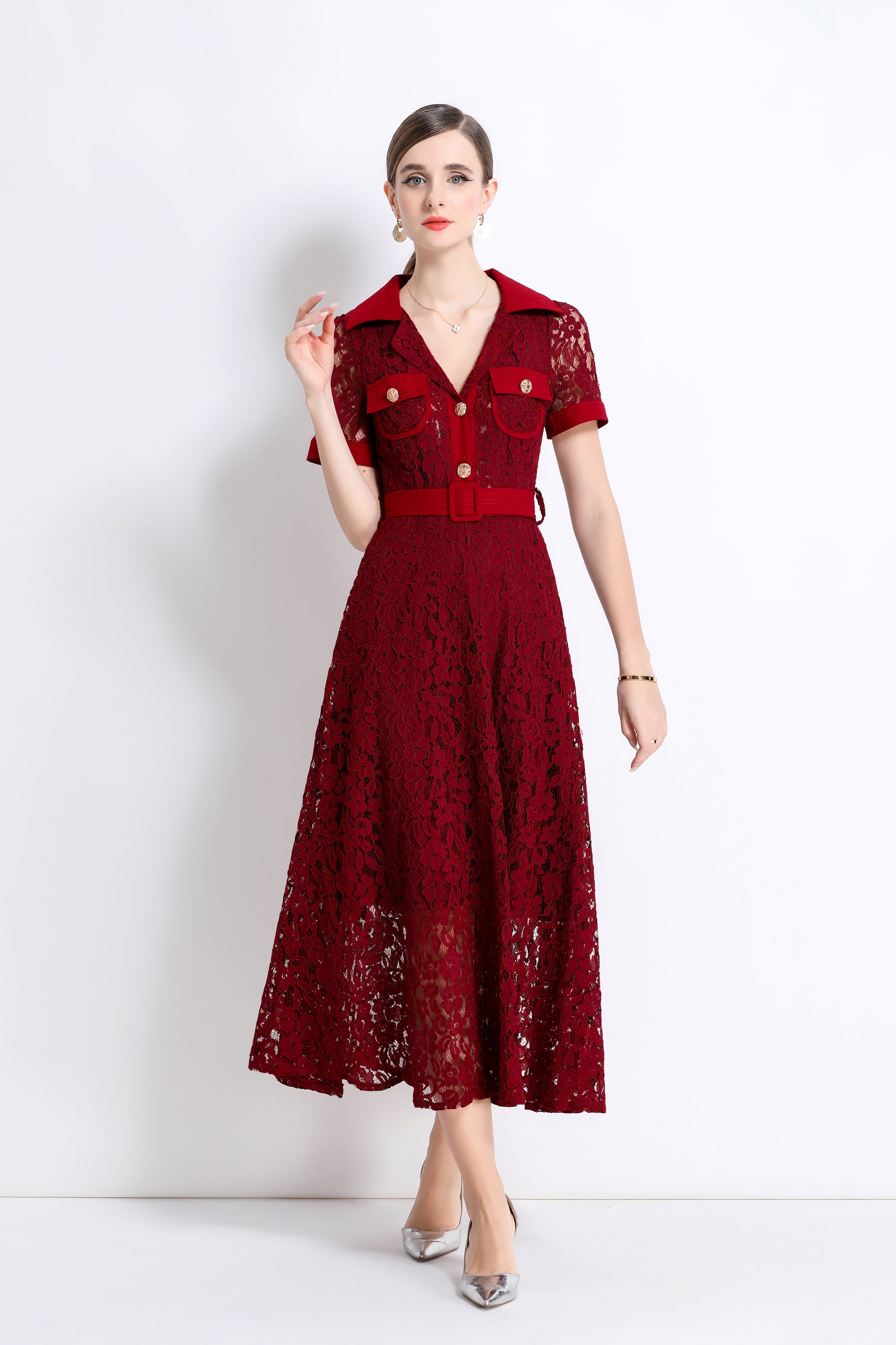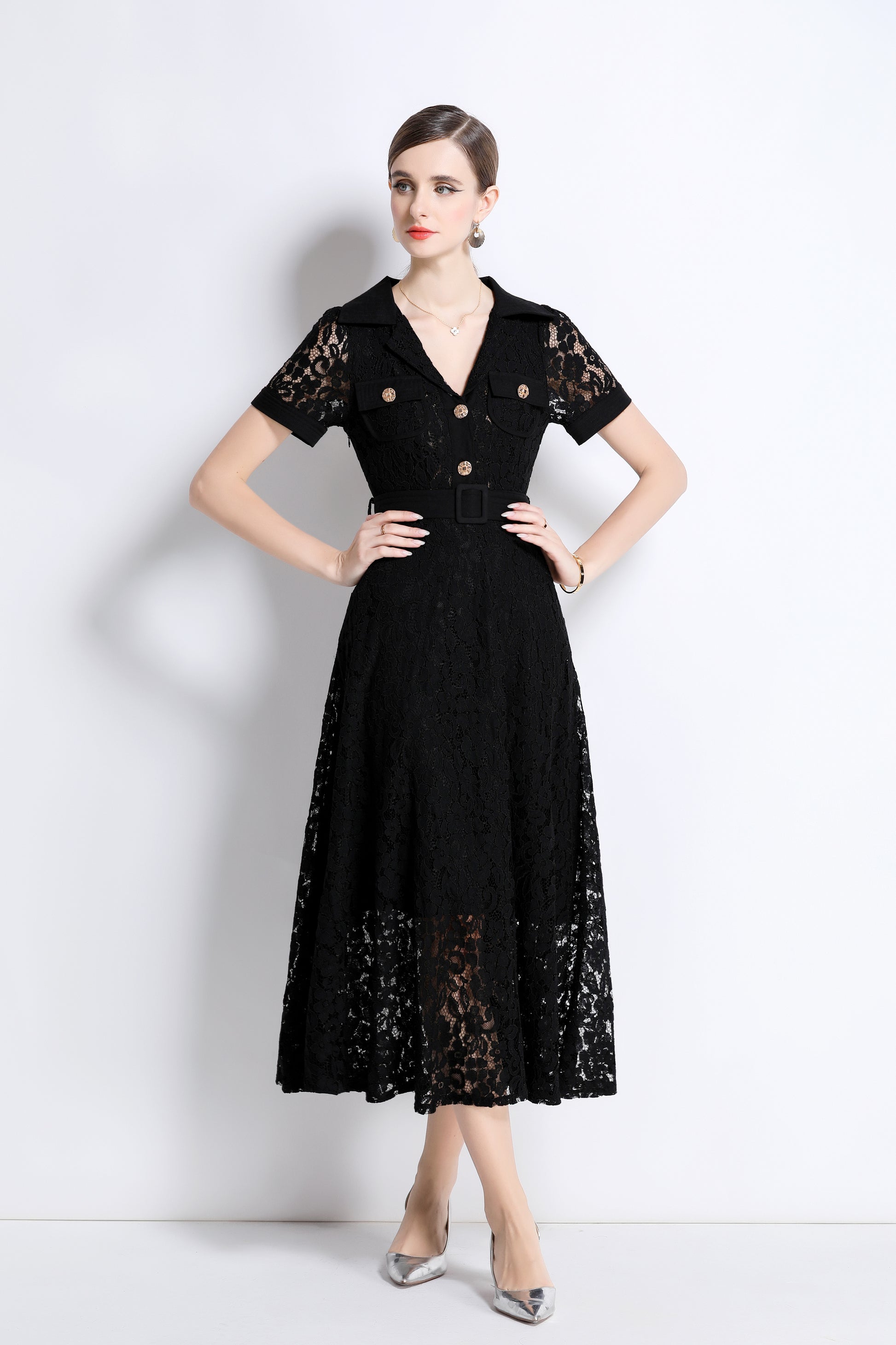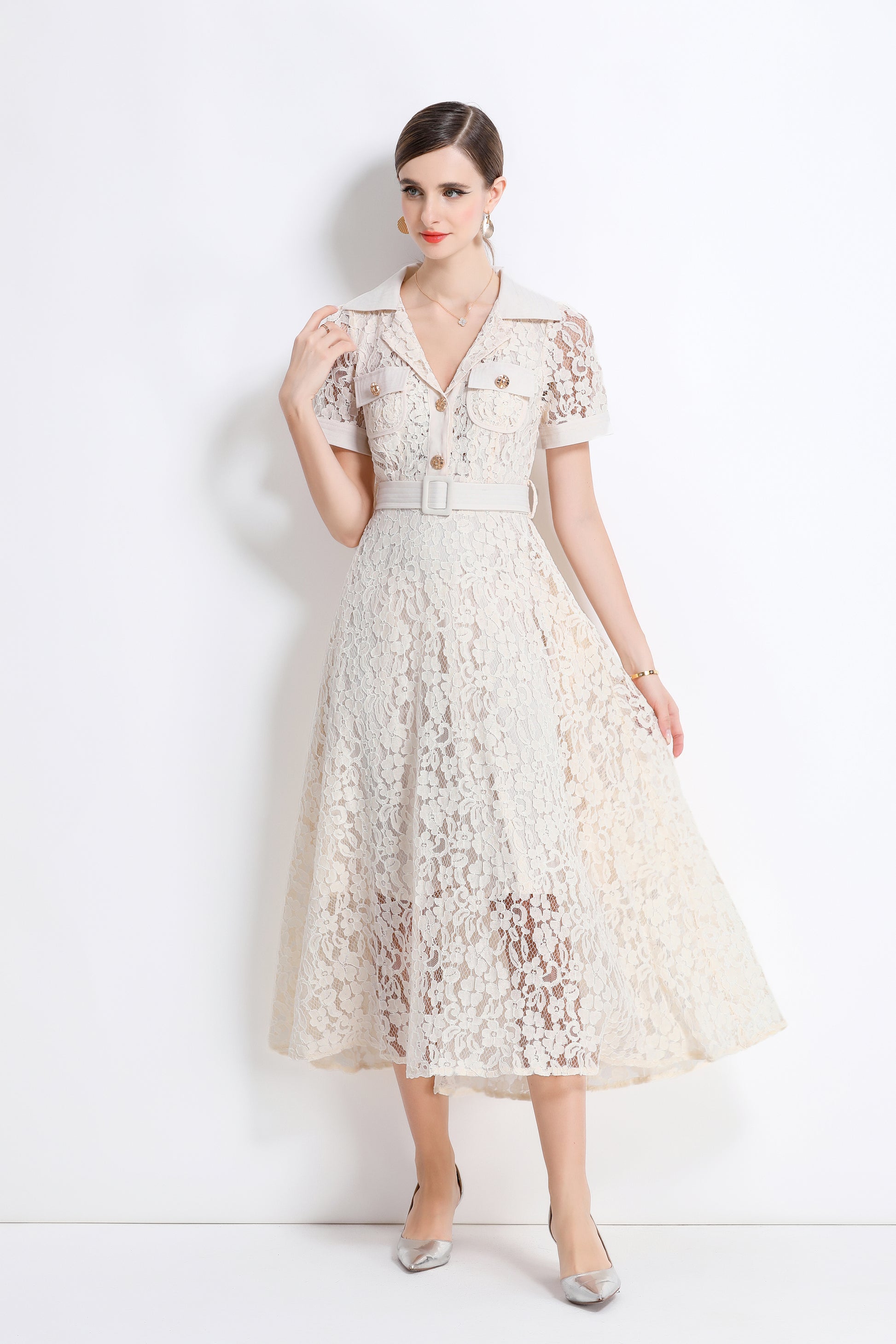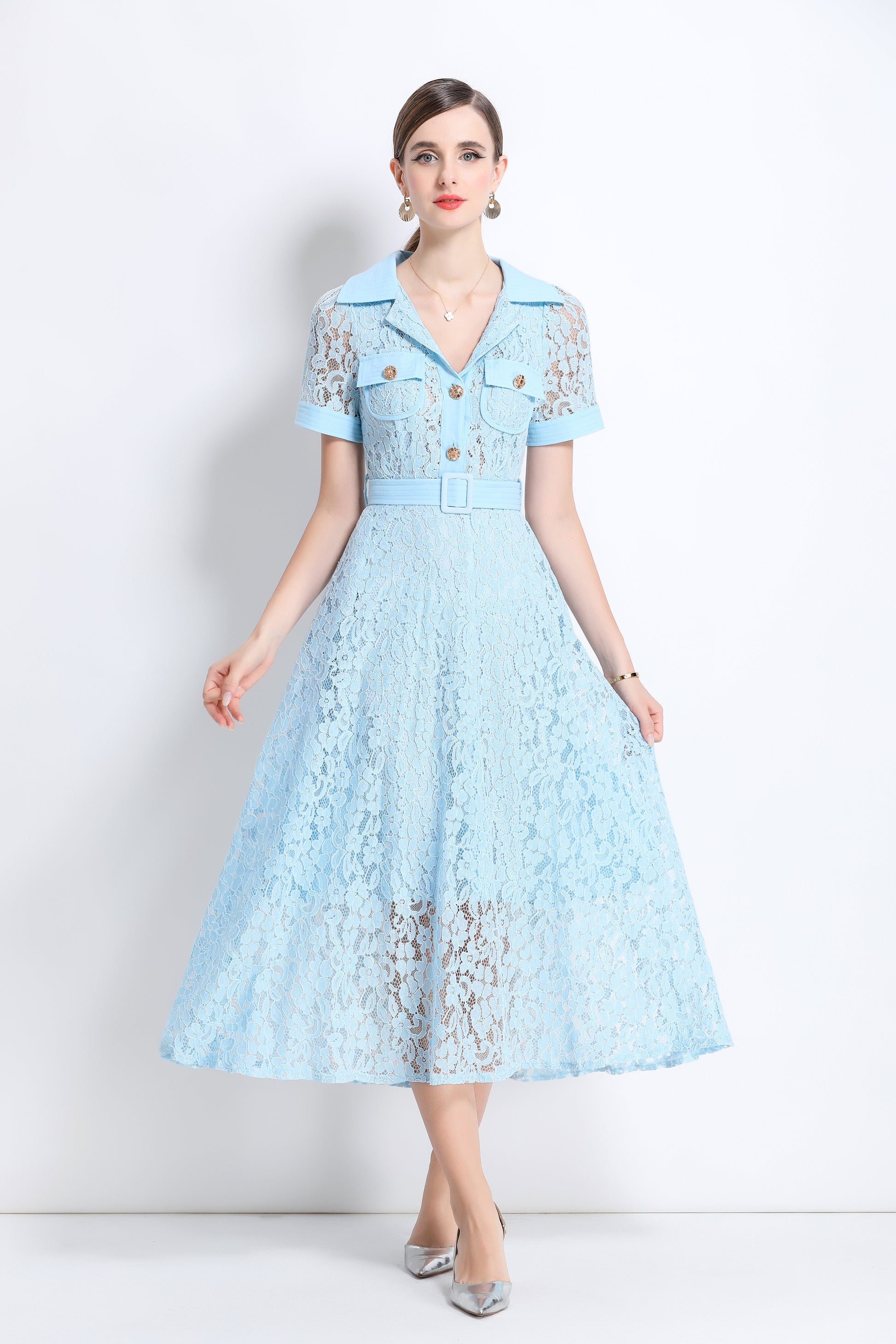 Features: lapel v neck, short sleeves, front buttons, with a belt, lace, lining, pocket decoration.