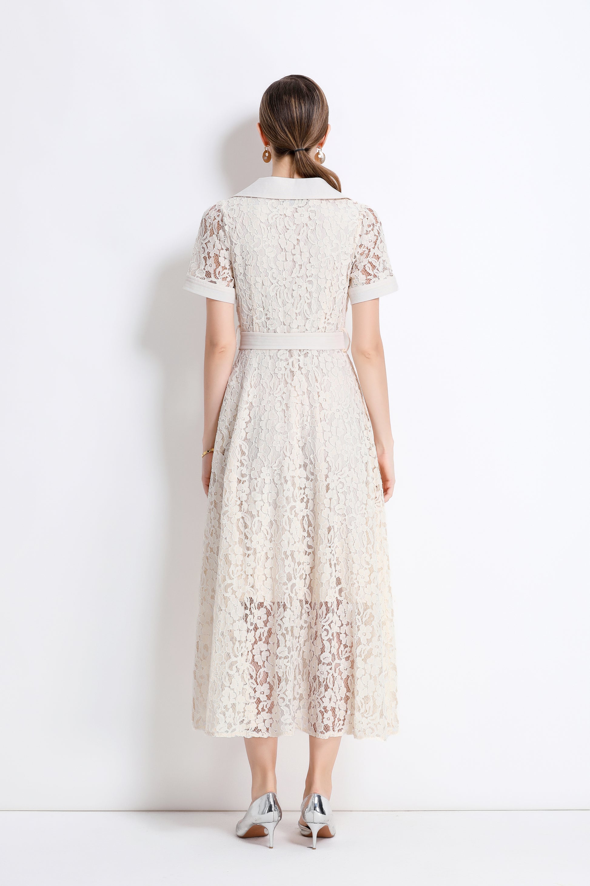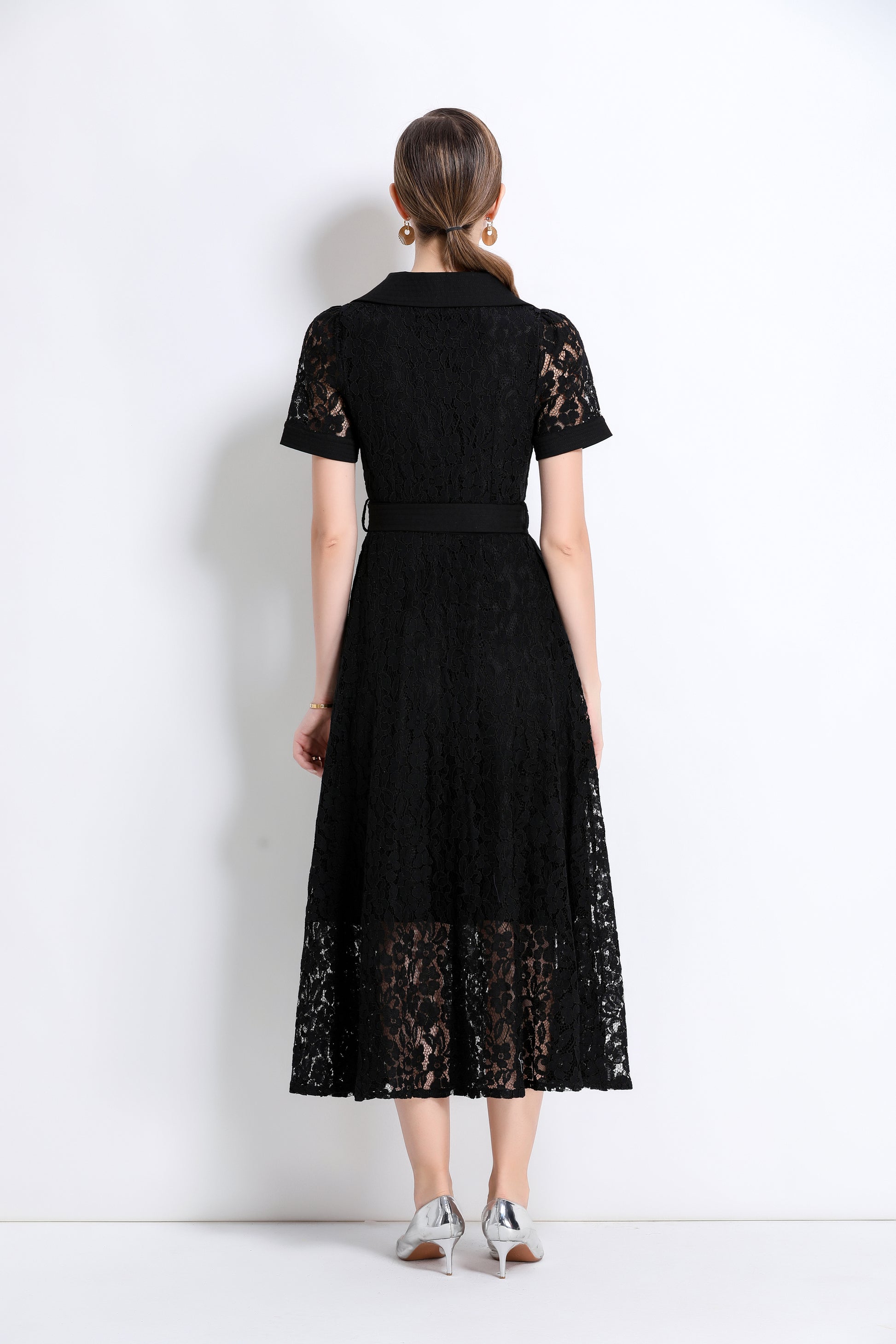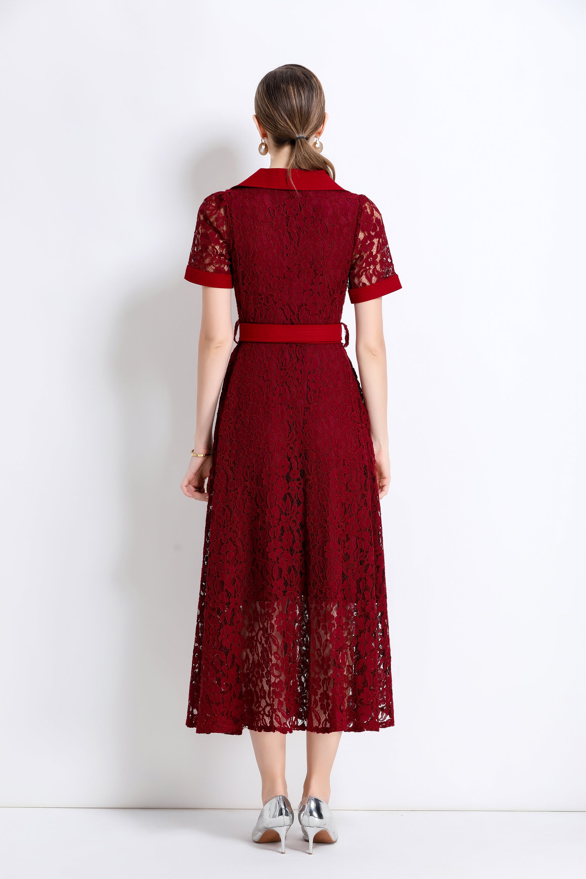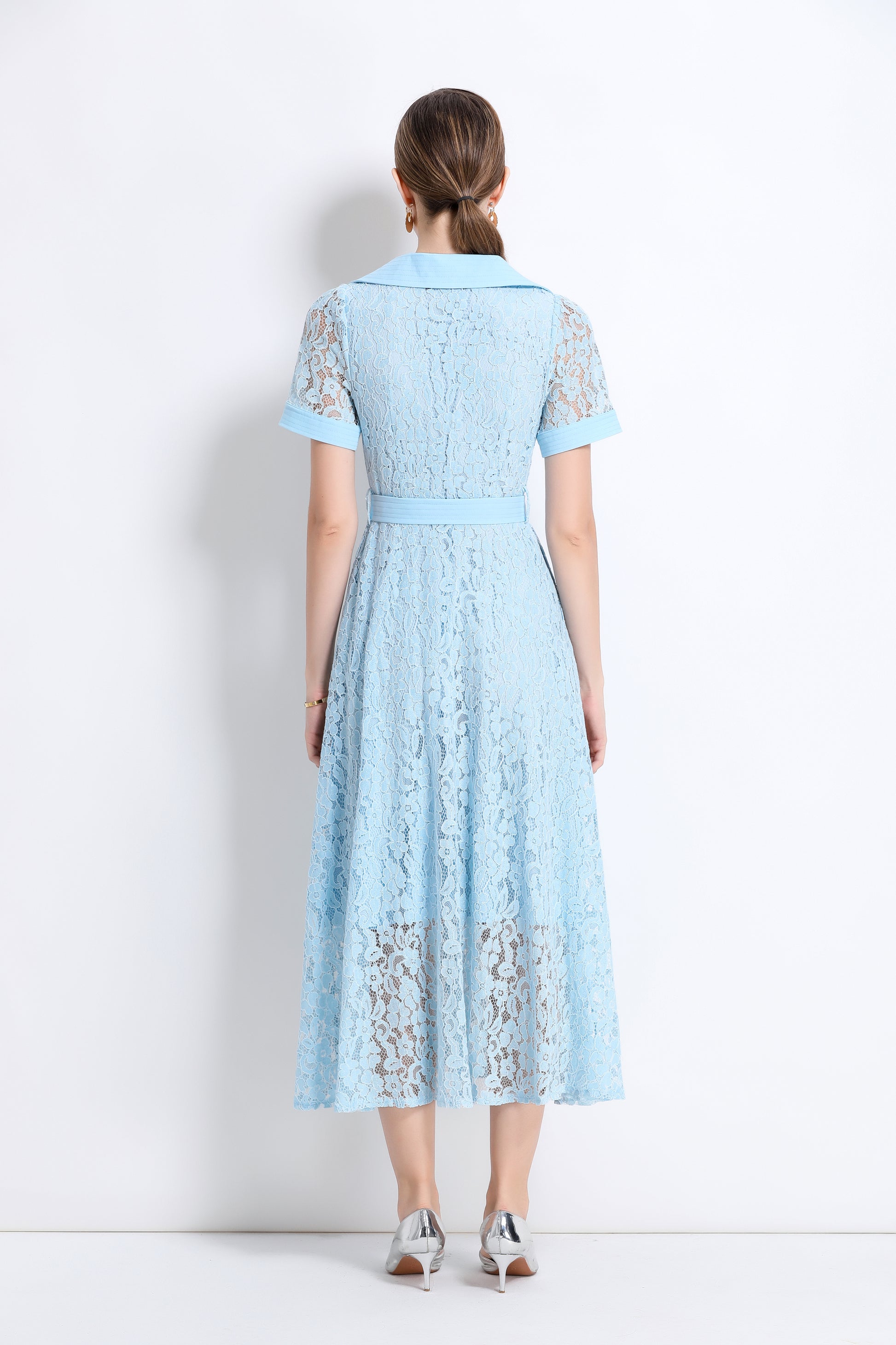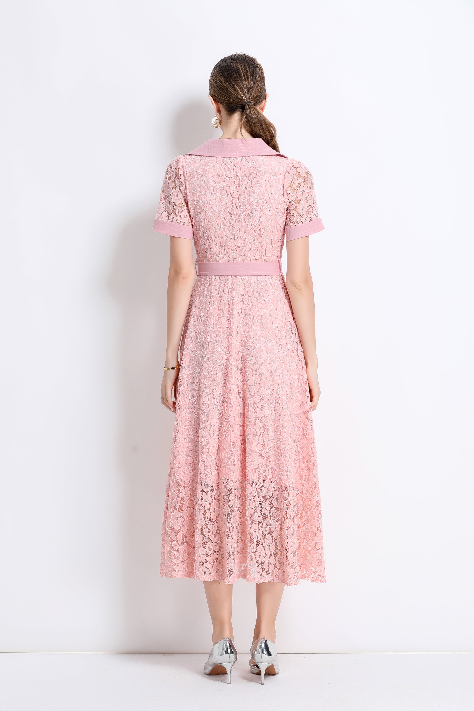 Features: lapel v neck, short sleeves, front buttons, with a belt, lace, lining, pocket decoration.