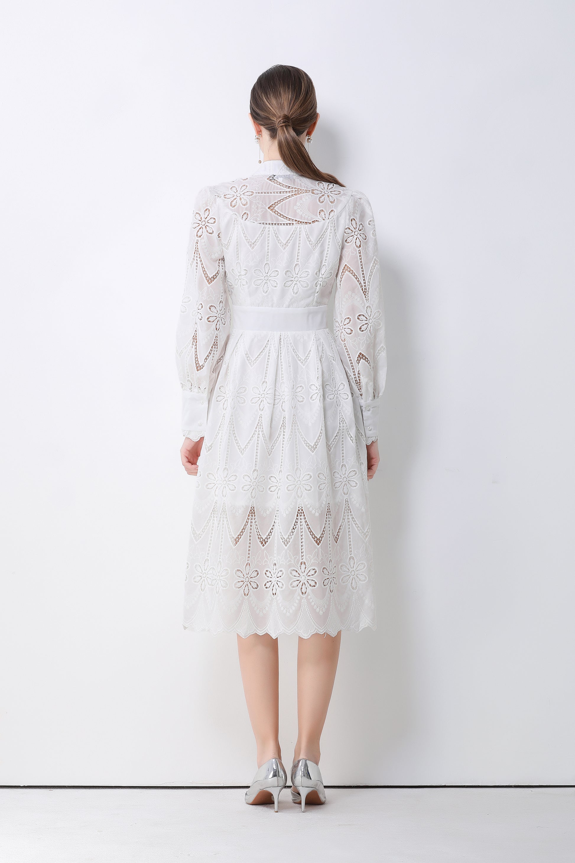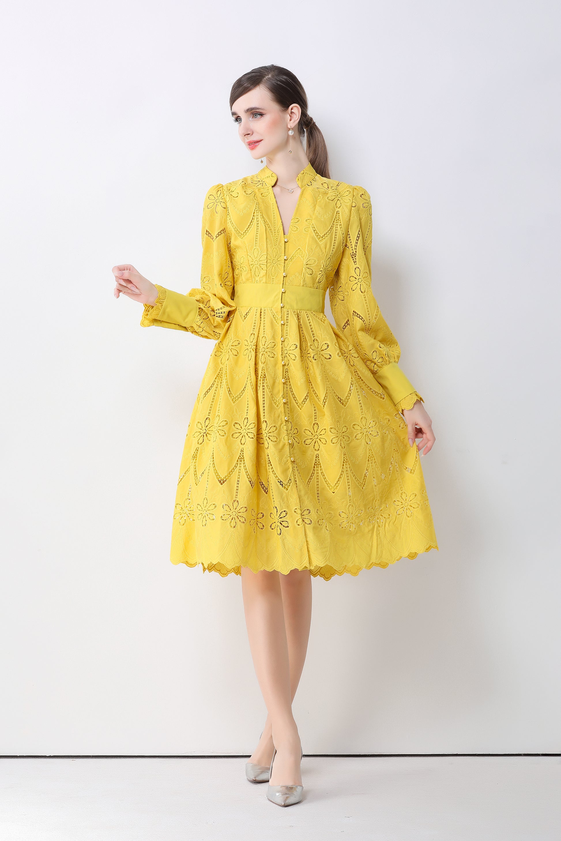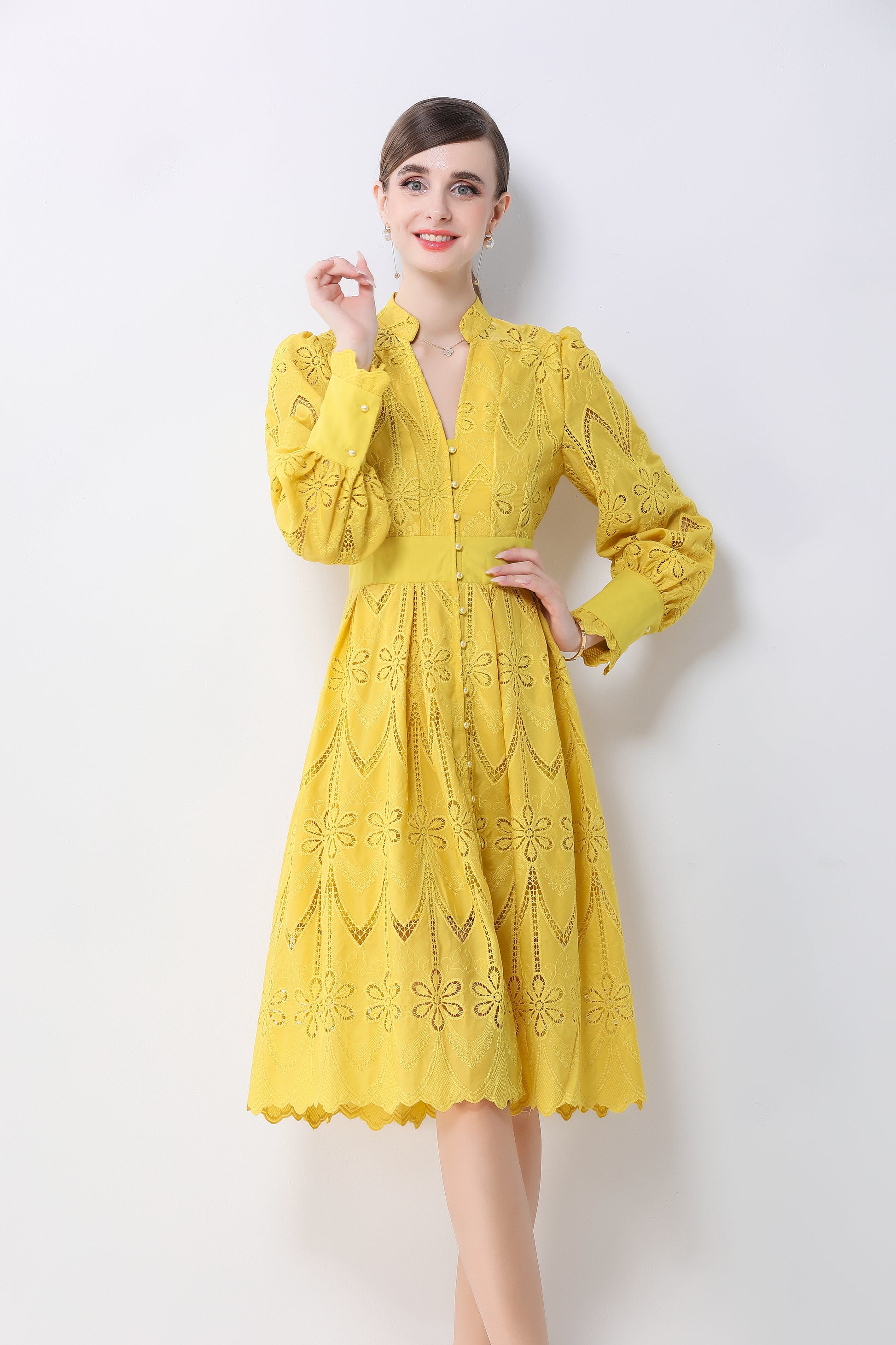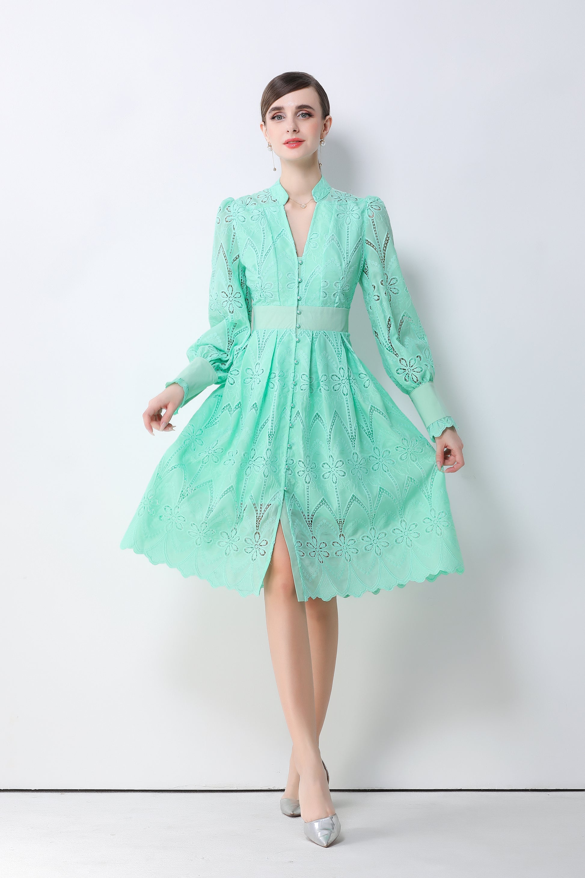 - Features: V-neck, hollowed-out embroidery, lantern long sleeves, single-row buttons,Pearl button,lace dress,midi length.
