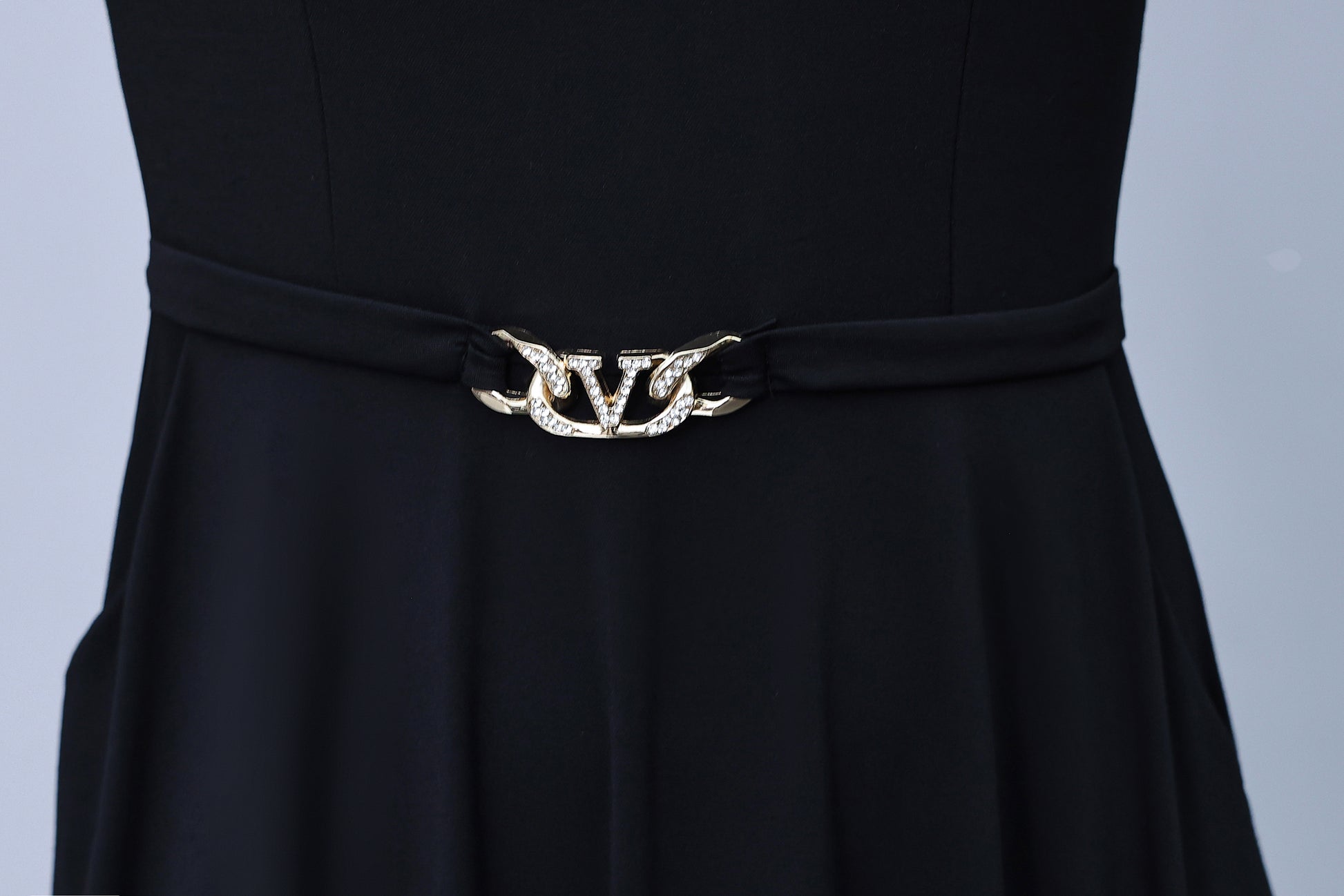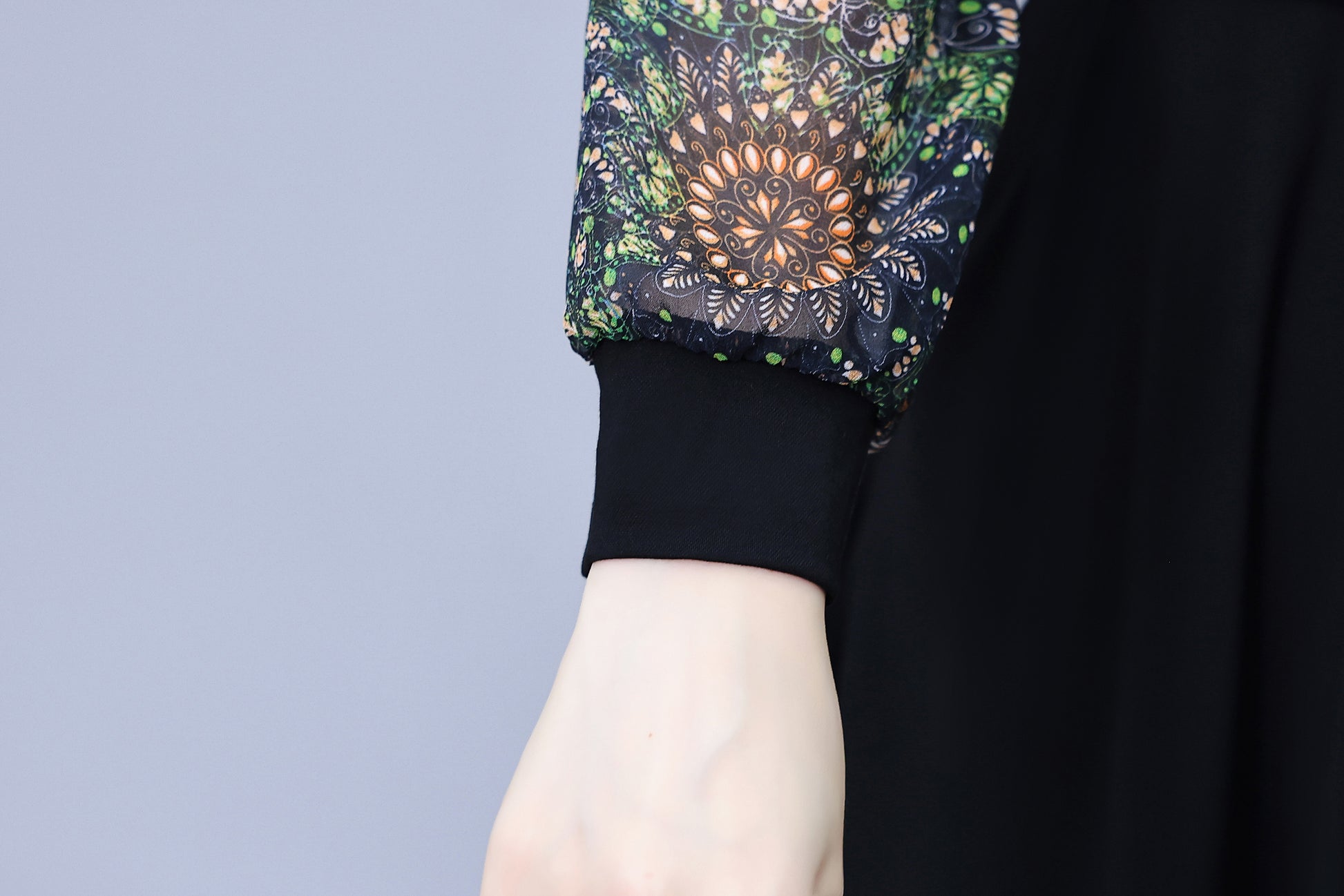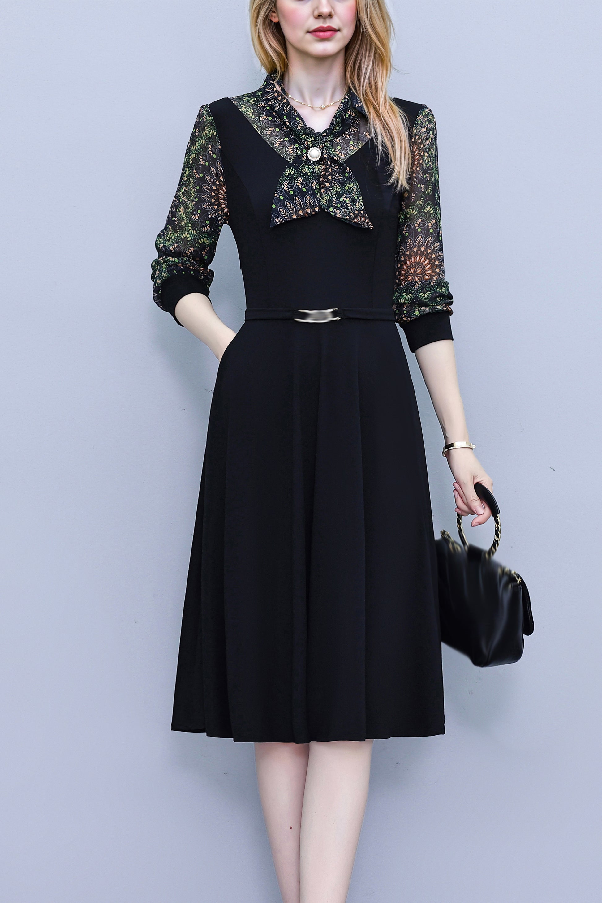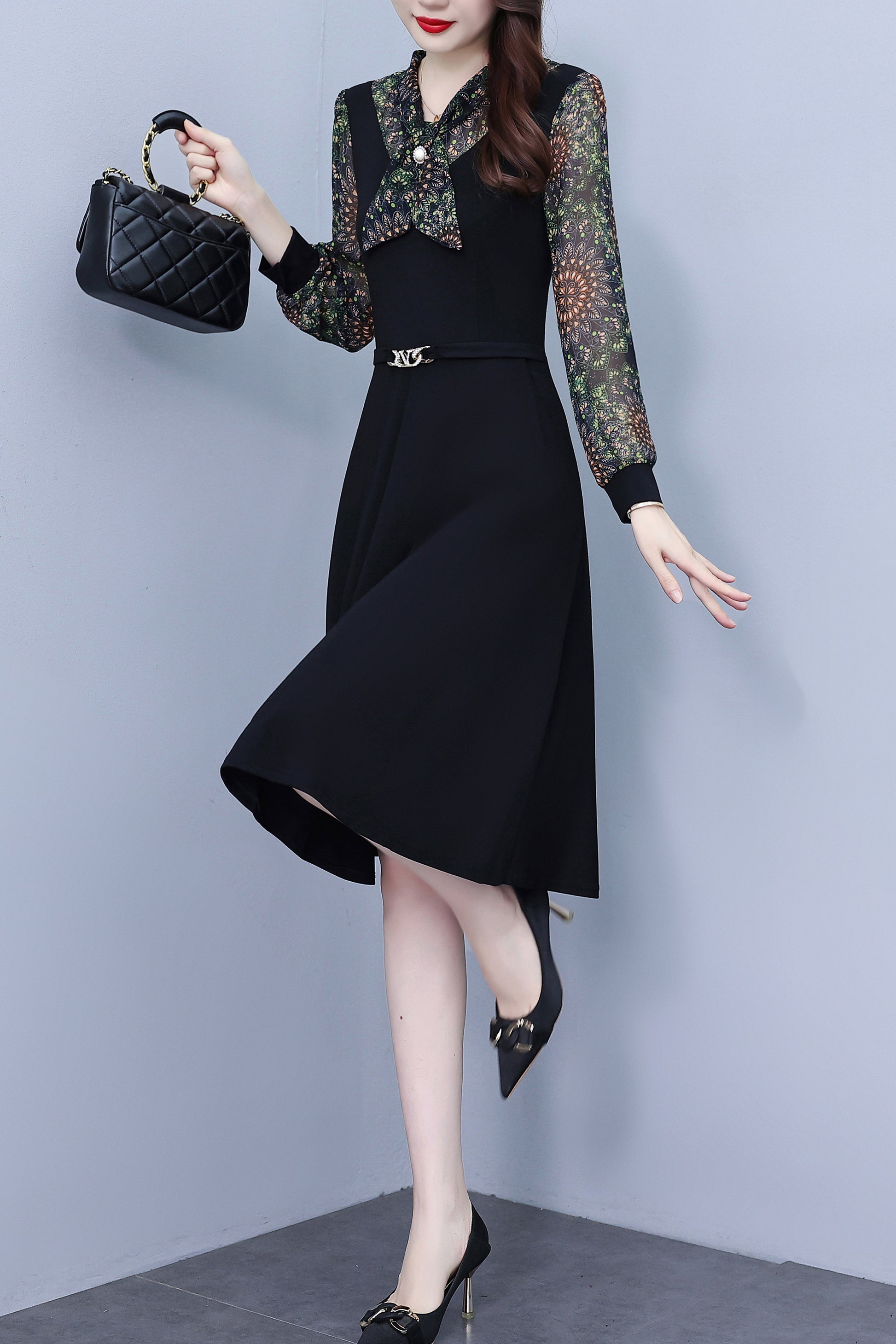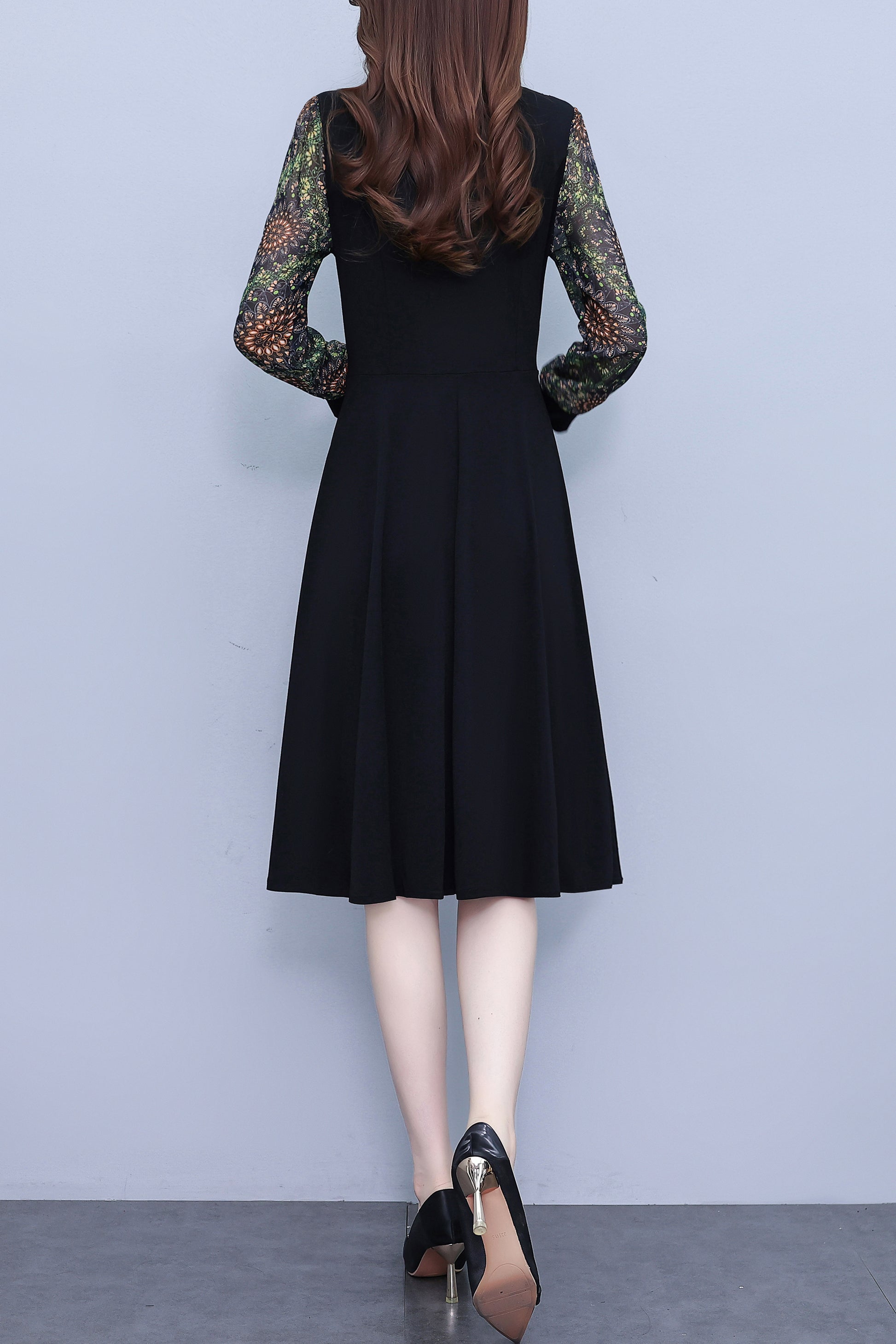 • Features:Black dress,Patchwork design,V-neck,long sleeve,A-line,Two Pocket,Side Zip,Elegant,Midi Length.