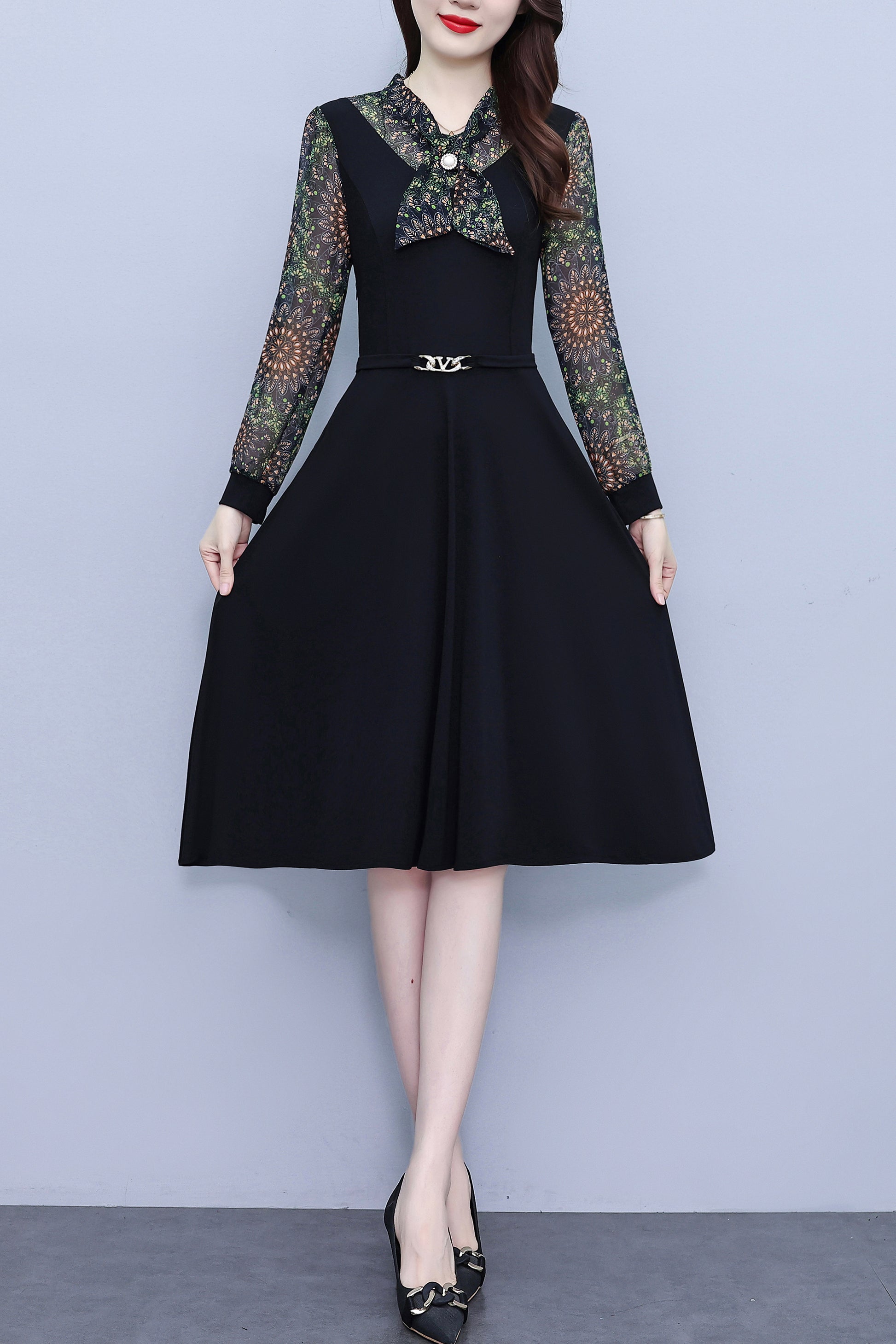 Women's V-Neck Long Sleeve Patchwork Black Dress