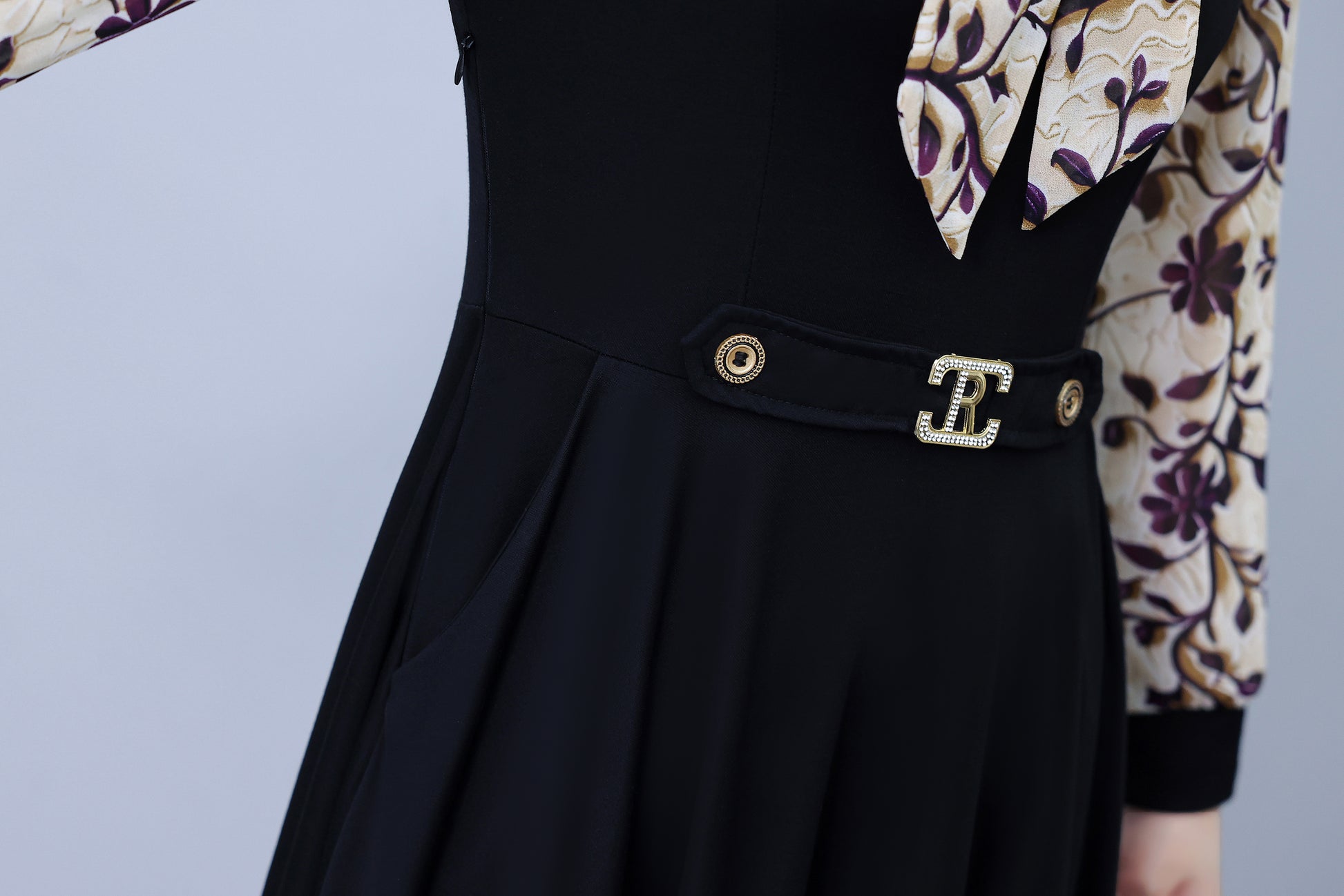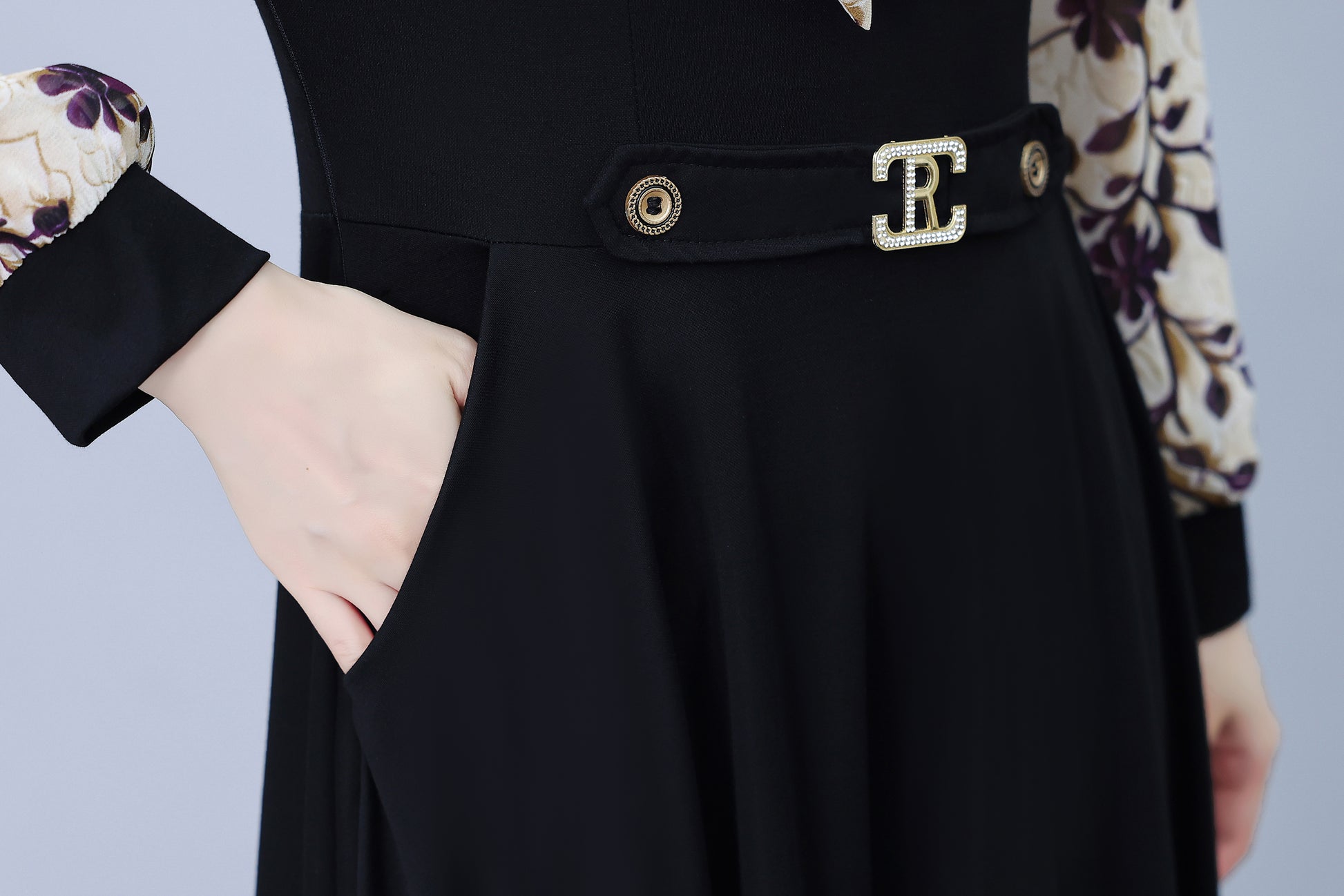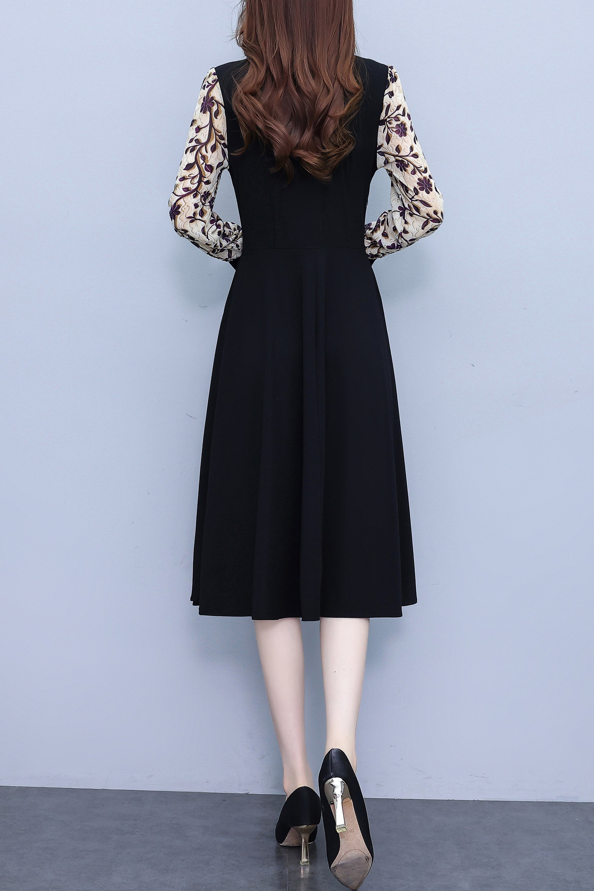 • Features:Black dress,Patchwork design,V-neck,long sleeve,A-line,Two Pocket,Side Zip,Elegant,Midi Length.