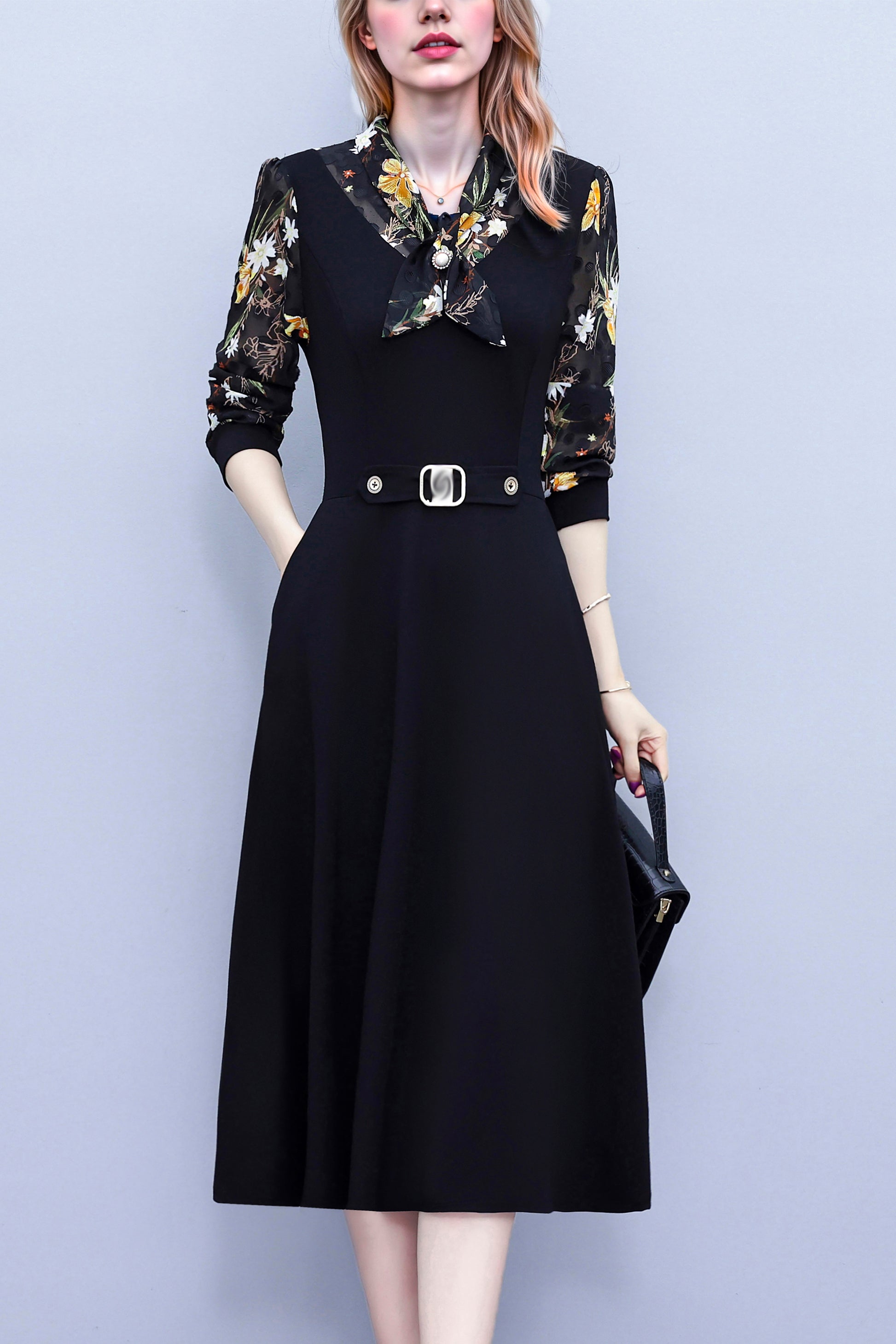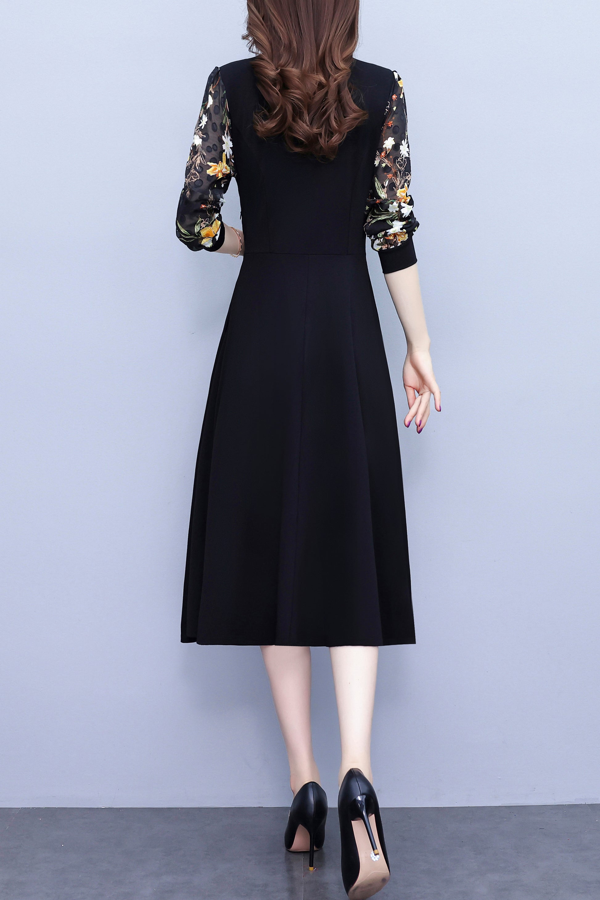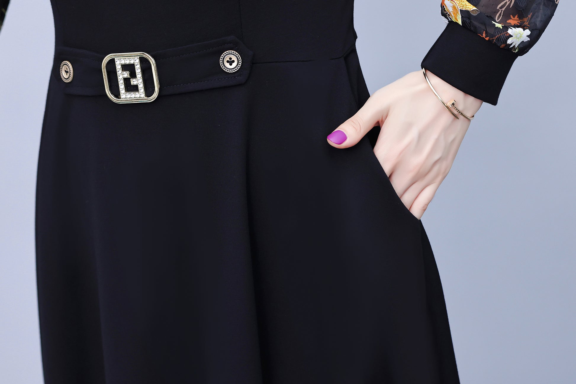 • Features:Black dress,Patchwork design,V-neck,long sleeve,A-line,Two Pocket,Side Zip,Elegant,Midi Length.