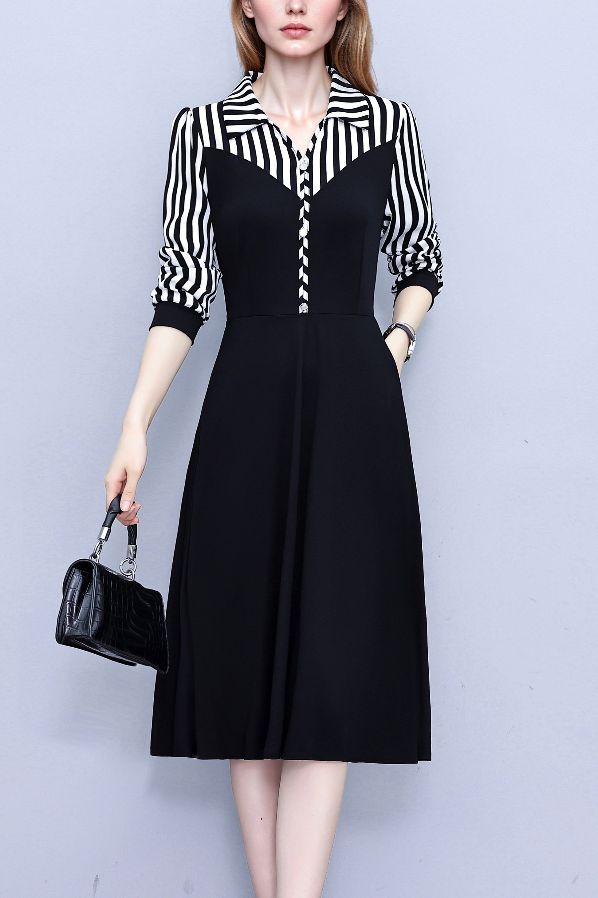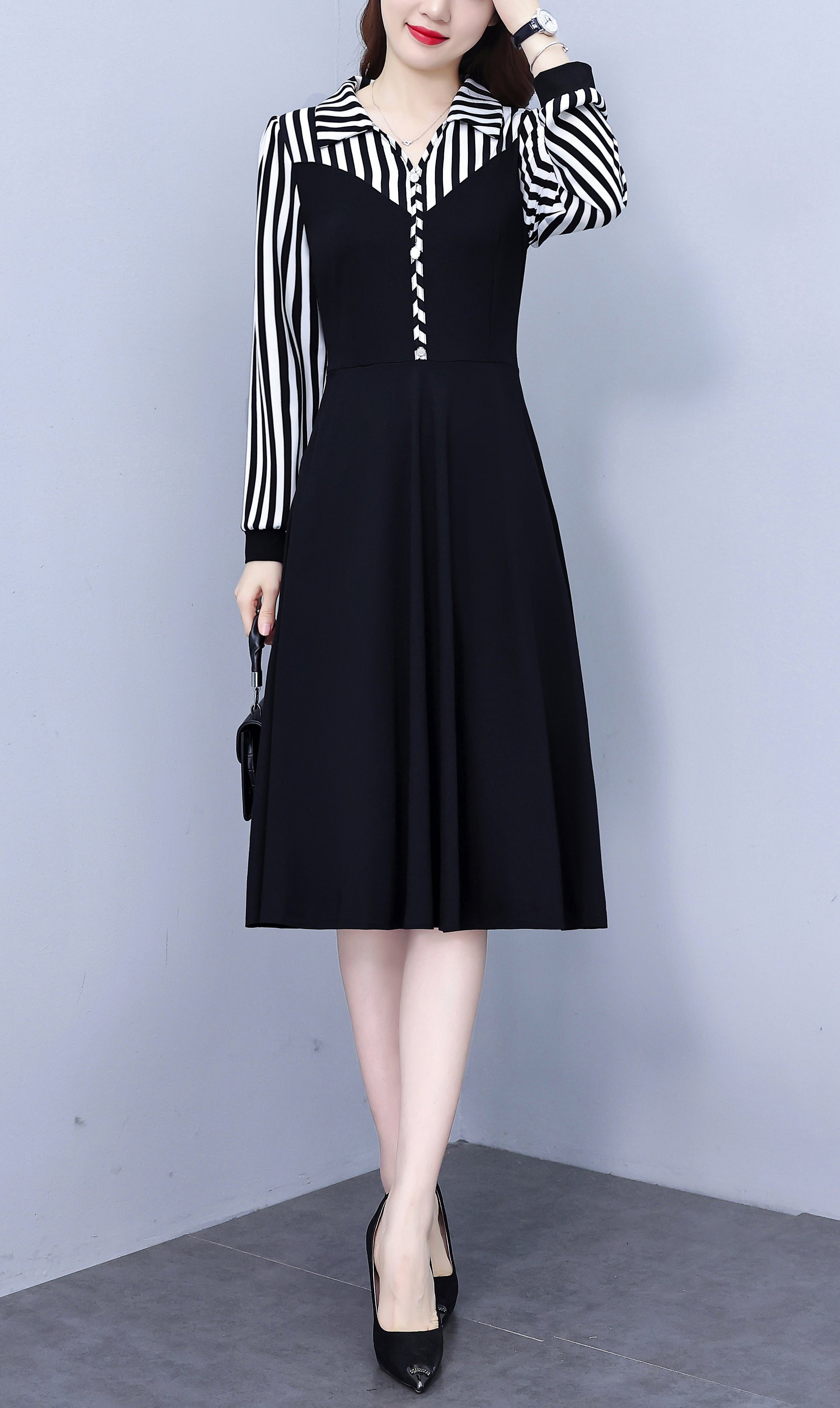 • Features:Black dress,V-neck,long sleeve,A-line,Two Pocket,Button,Elegant Dress,Midi Length,Striped dress.