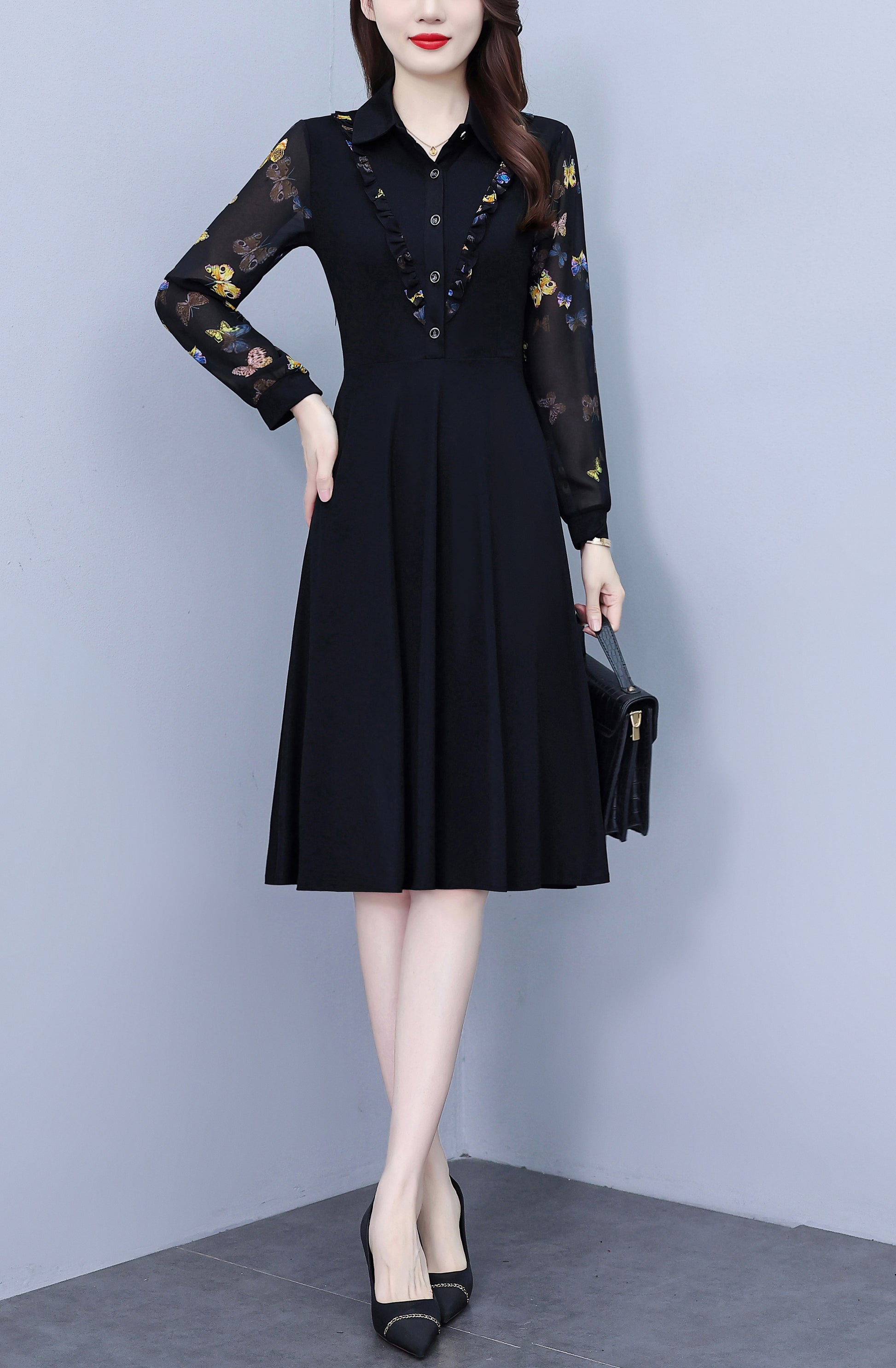 • Features:Black dress,V-neck,long sleeve,A-line,floral print dress,Button,Elegant Dress,Midi Length.