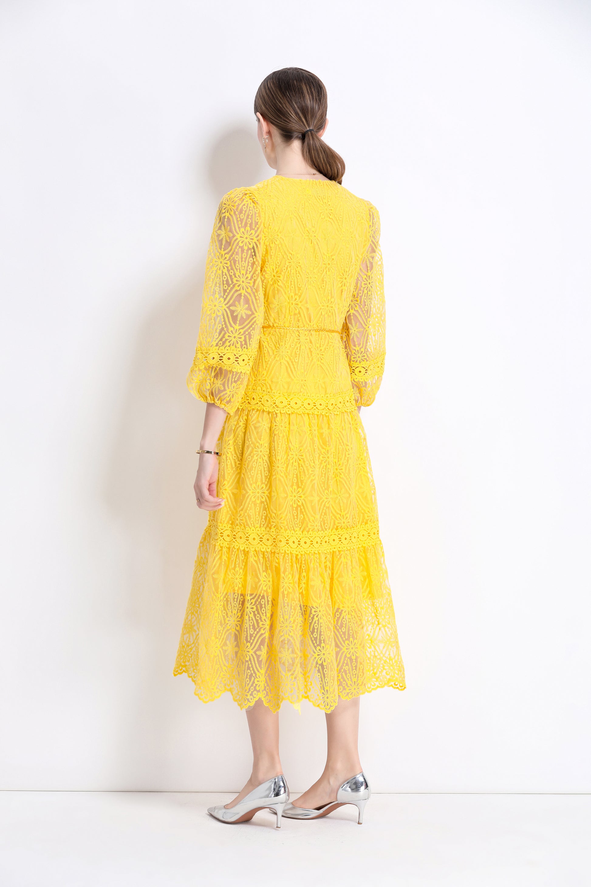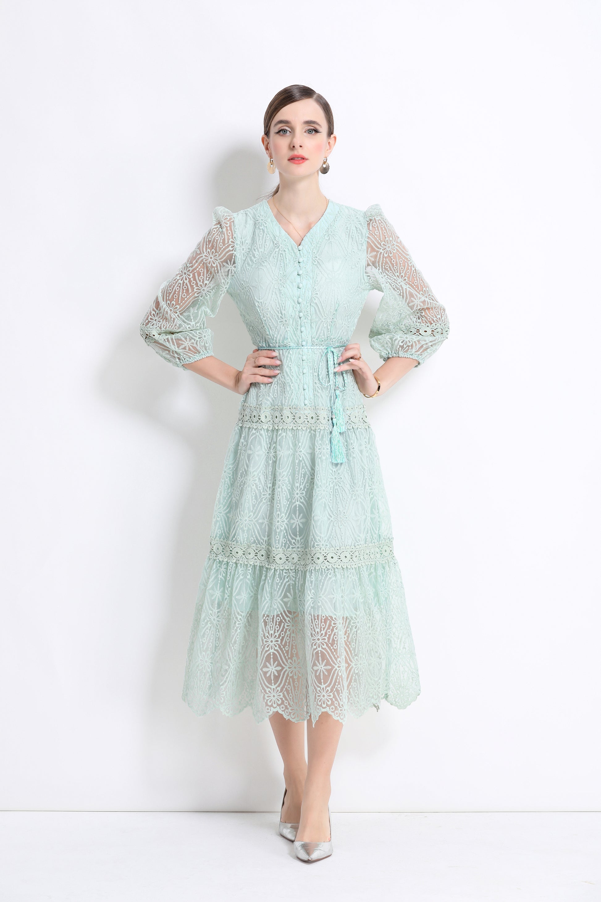 Women's V-Neck Mesh Embroidery Lace Midi Dress