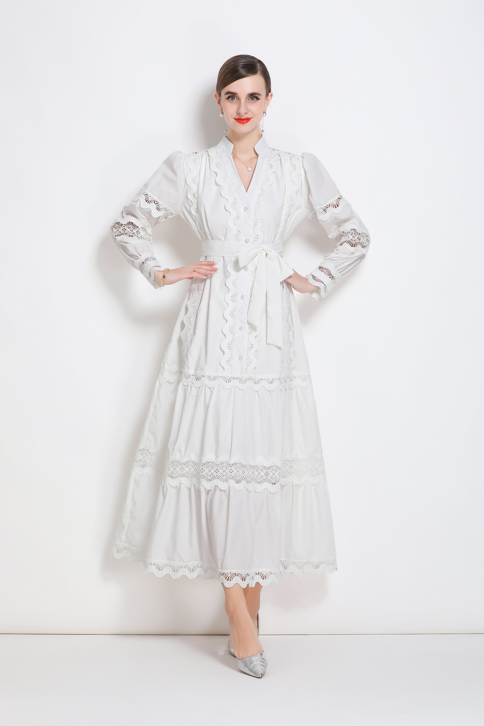 - Features:Puffed sleeves,loose fit,pleated,hollowed-out pattern design,lace trim decoration,V-neck,front buttons,Tiered,solid color,waist strap design,long dress.
