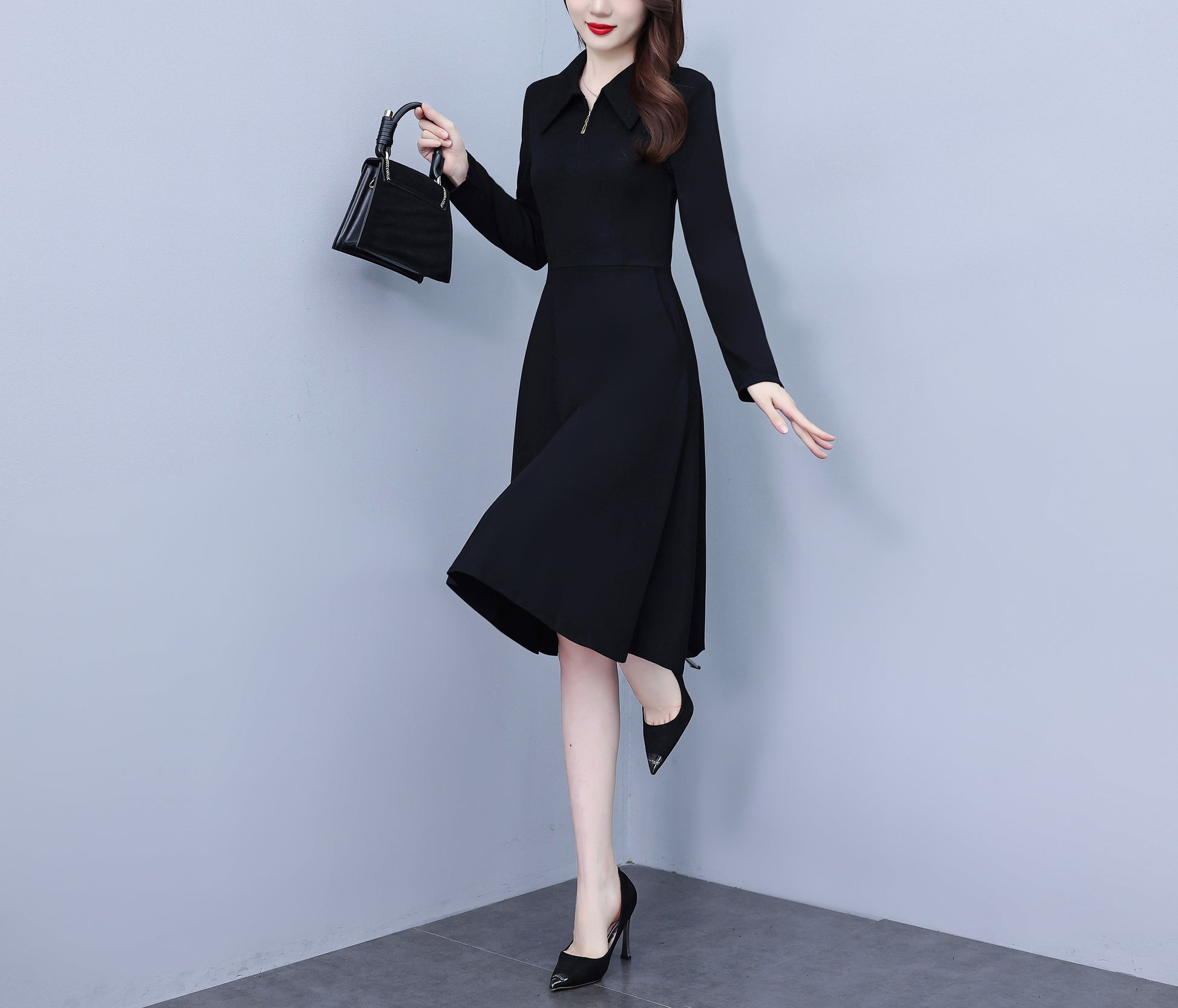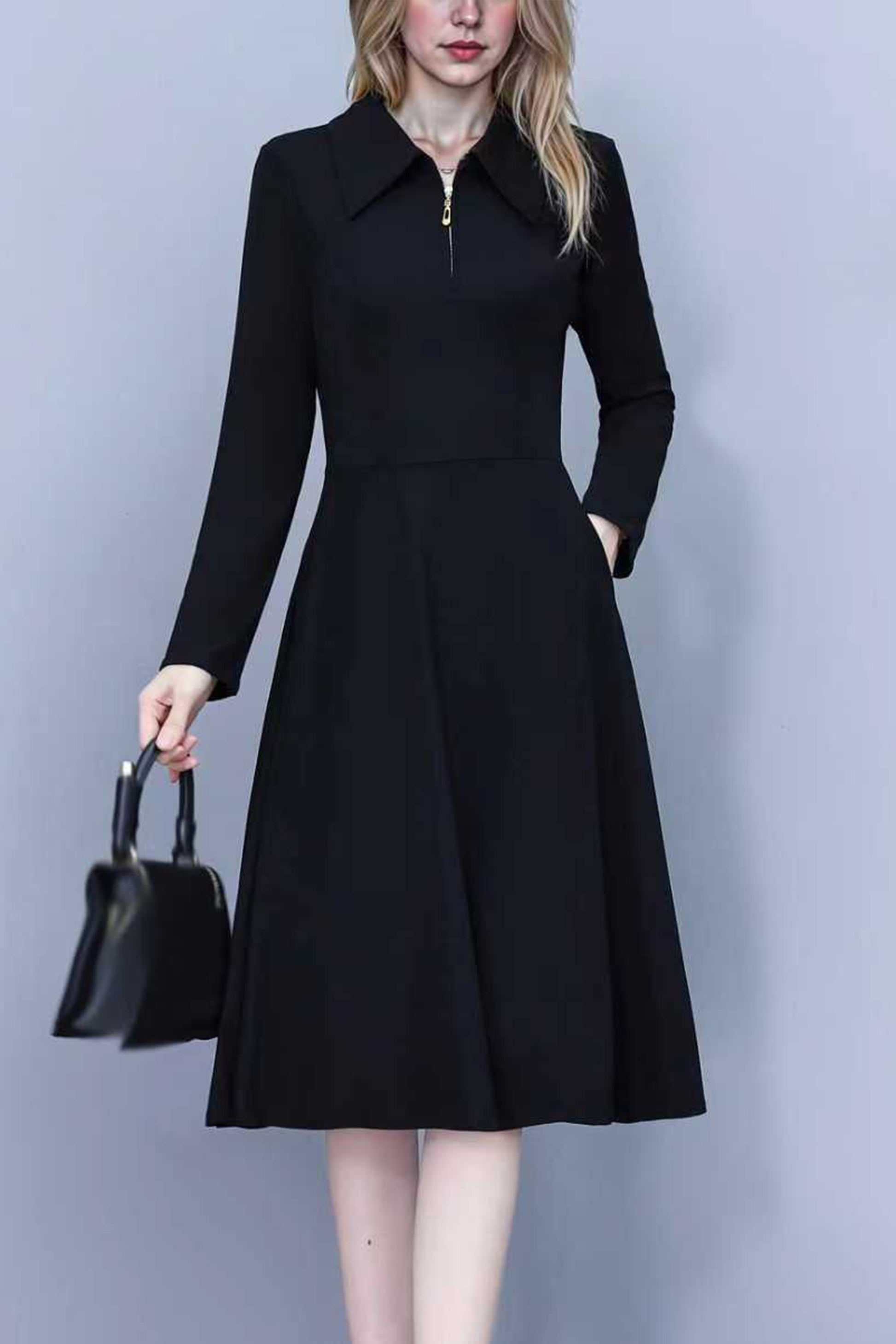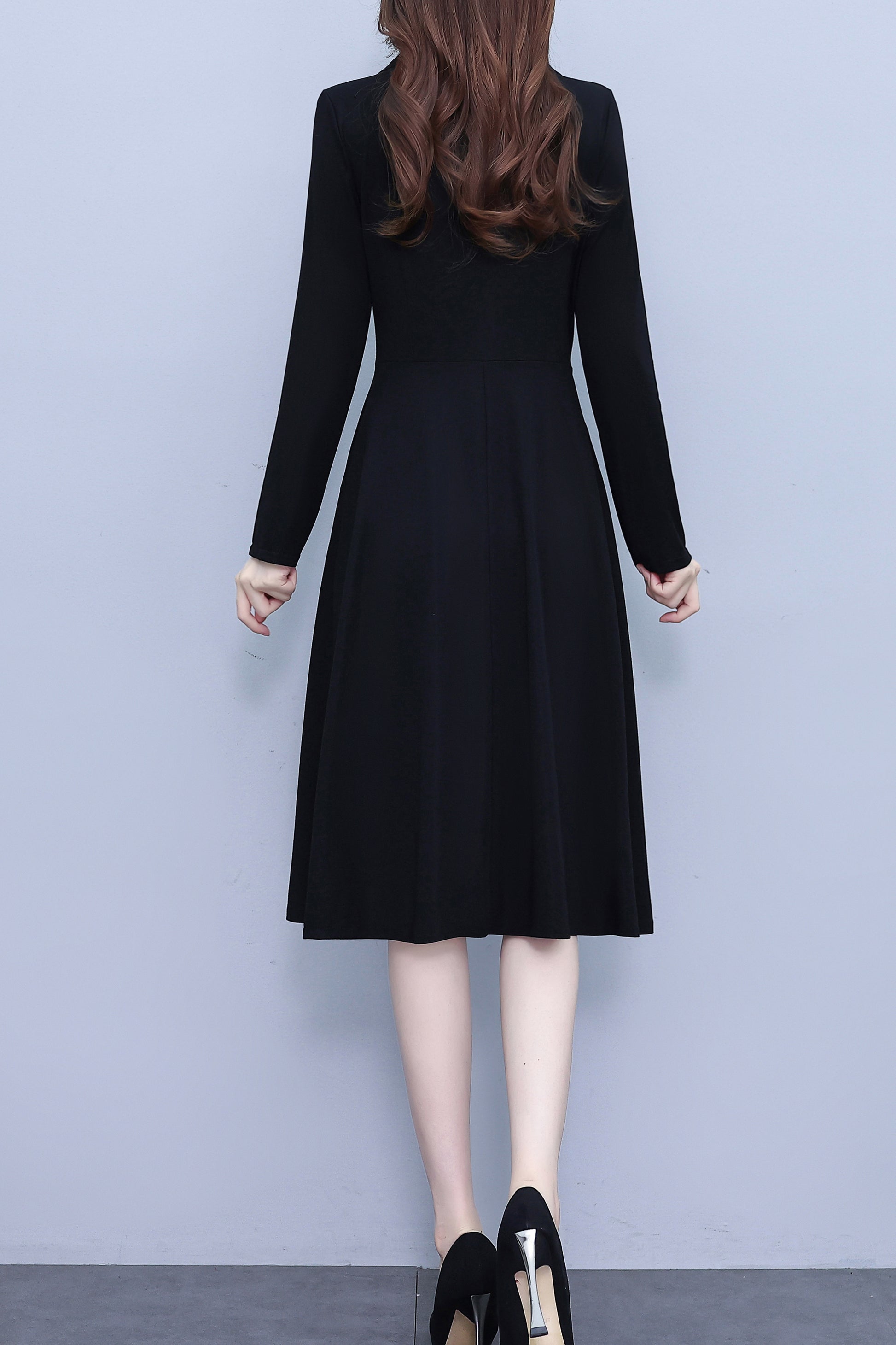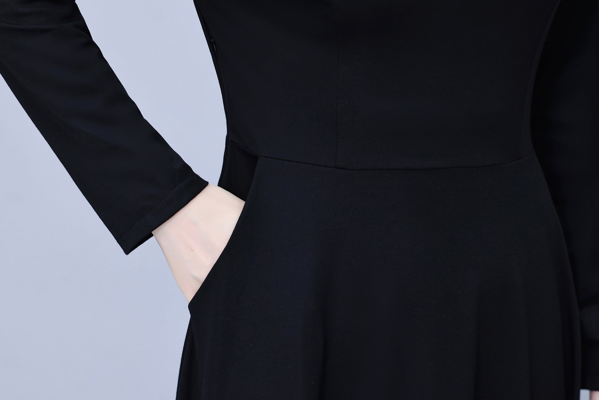 • Features:Black dress,V-neck,long sleeve,A-line,Two Pocket,Button,Elegant Dress,Midi Length.