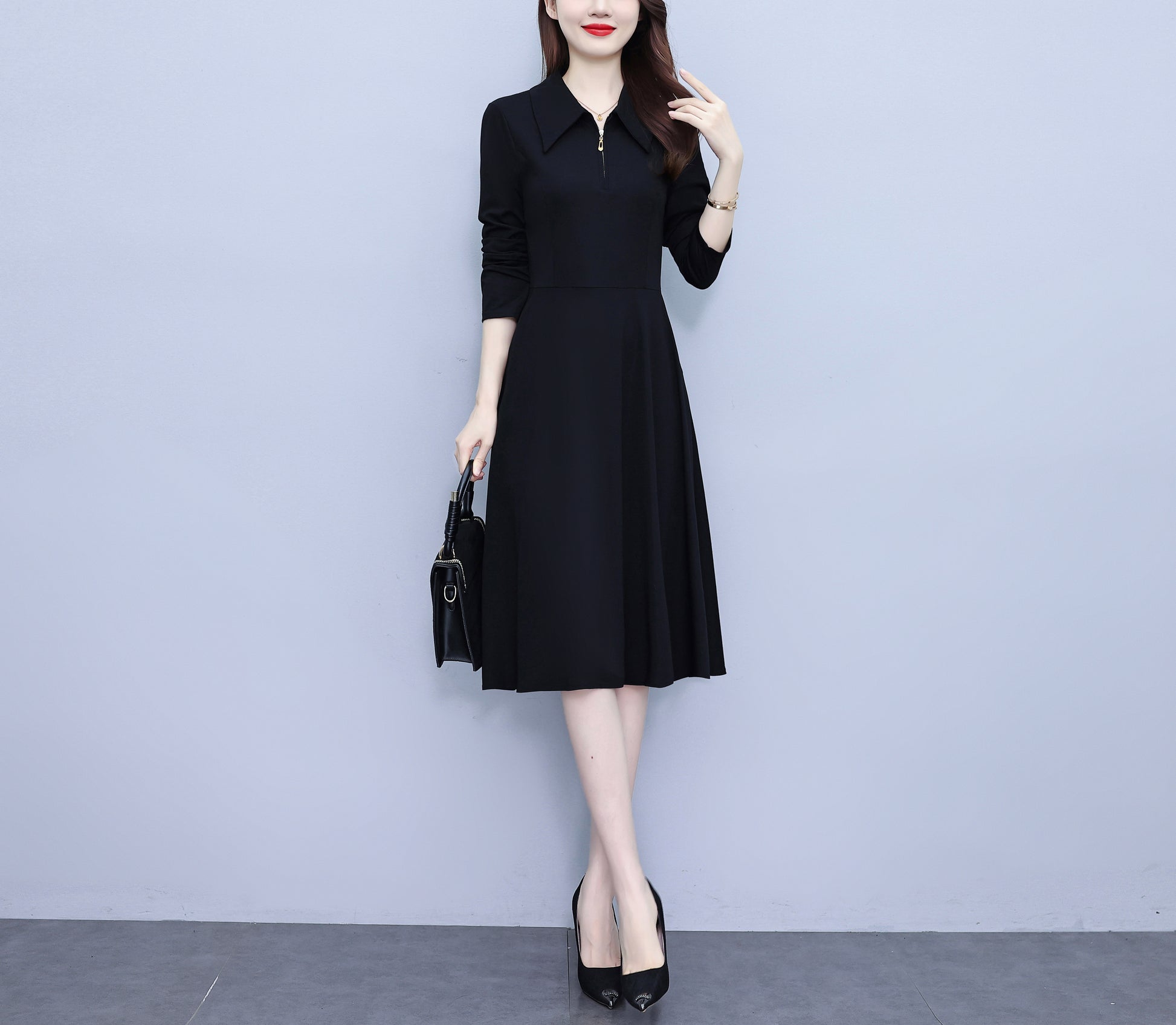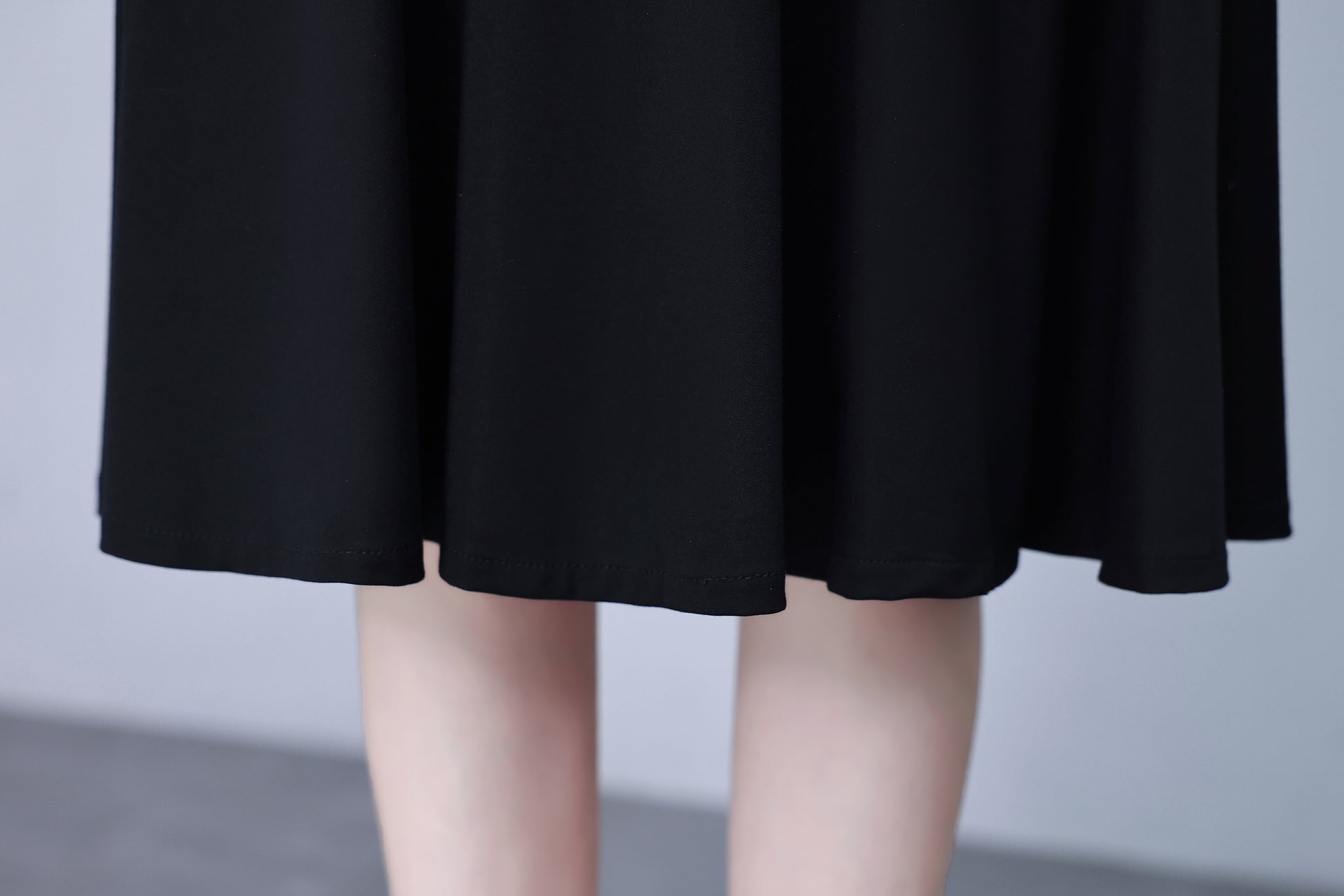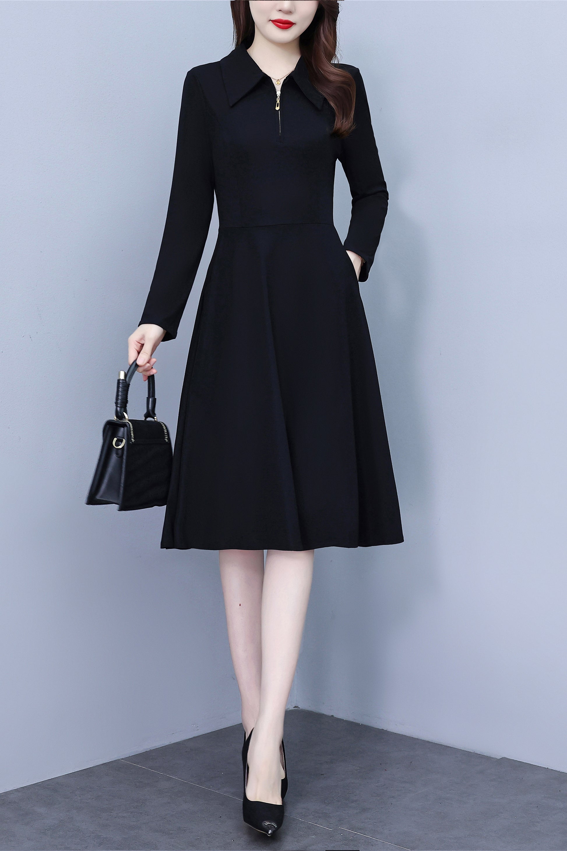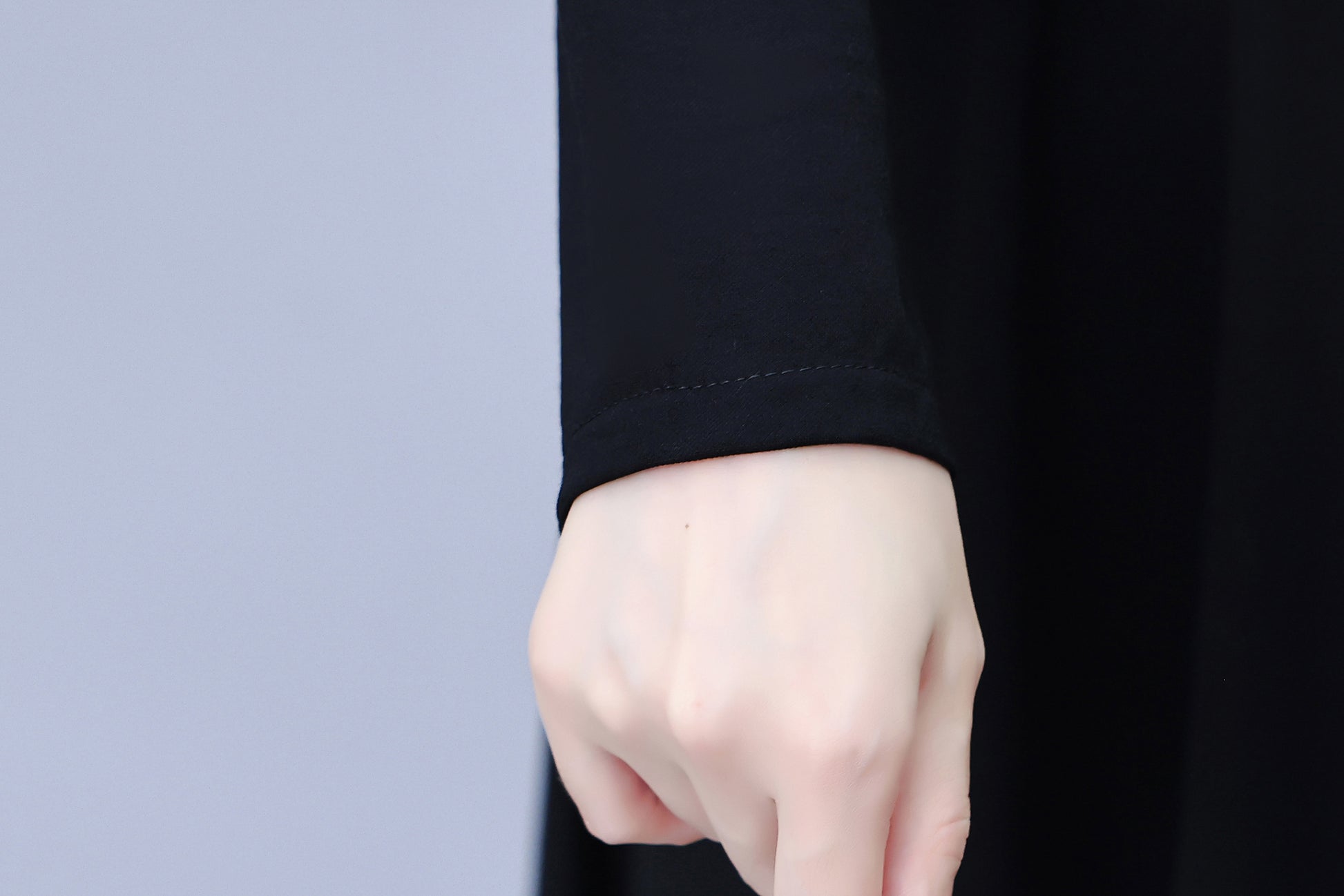 • Features:Black dress,V-neck,long sleeve,A-line,Two Pocket,Button,Elegant Dress,Midi Length.