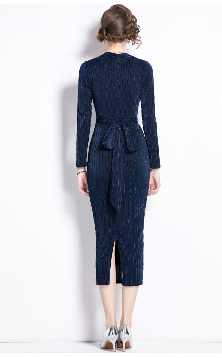 Women's velvet deep V-neck lace-up midi dress with hip wrap