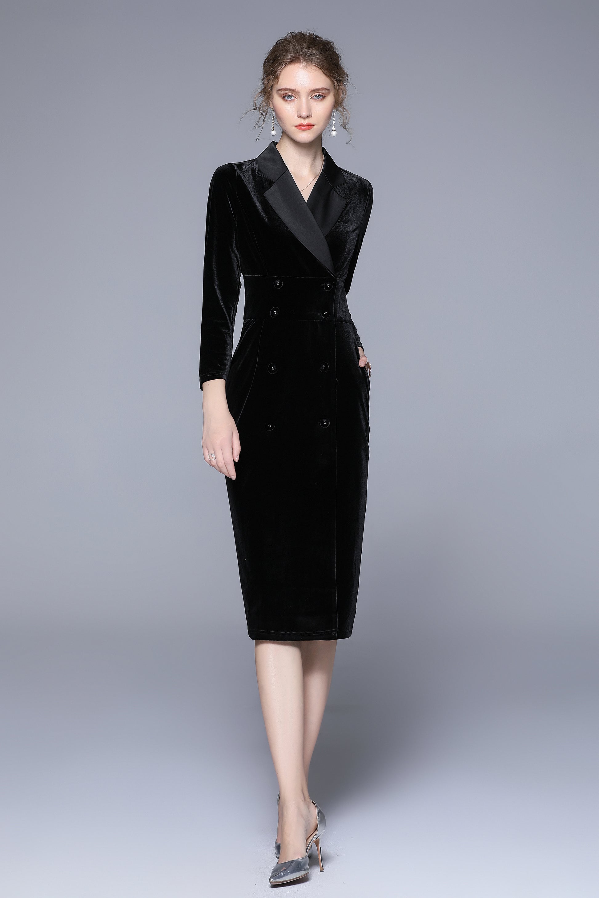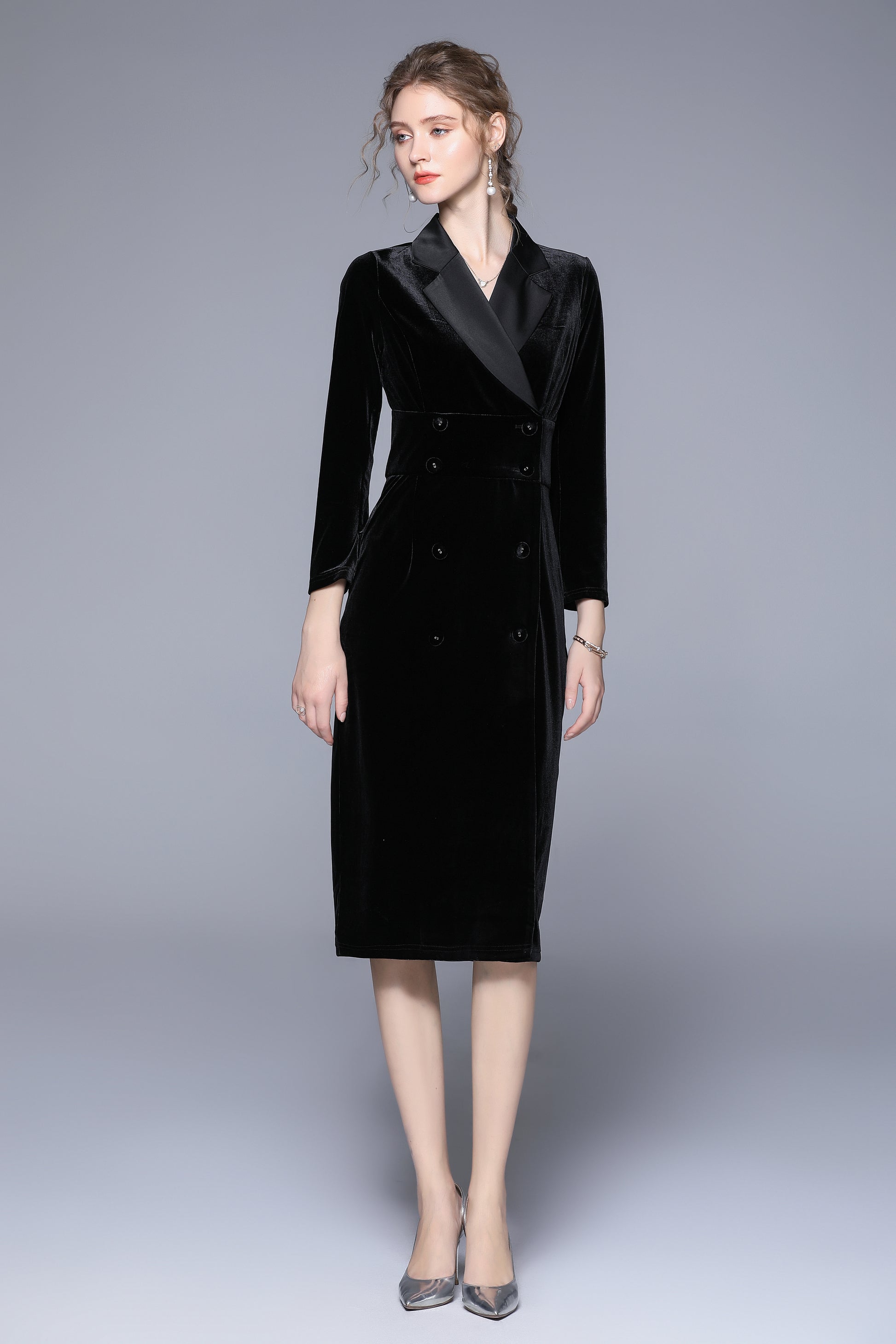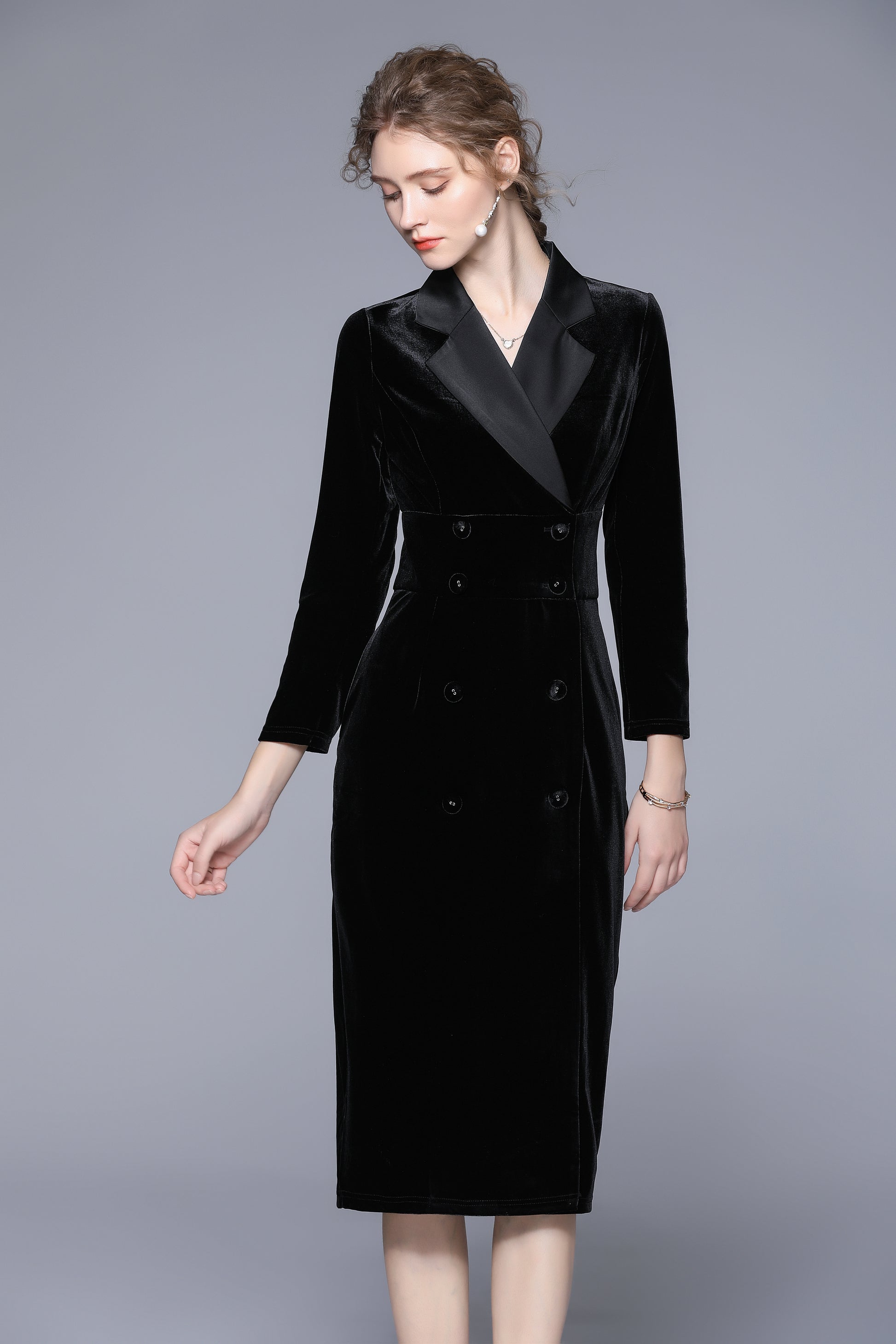 Double-breasted design: The classic double-breasted design adds a touch of formality and vintage to this midi dress, suitable for many occasions.