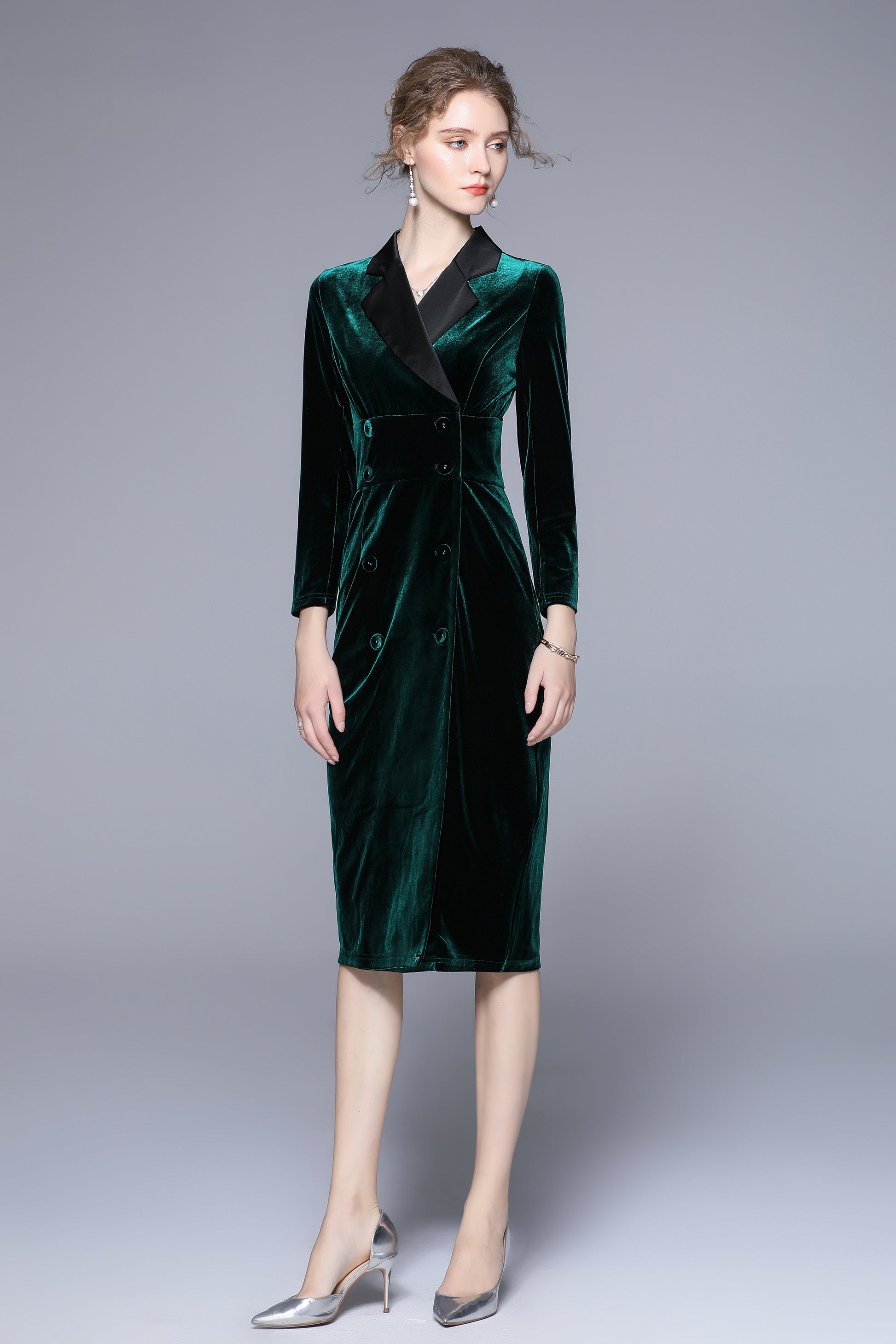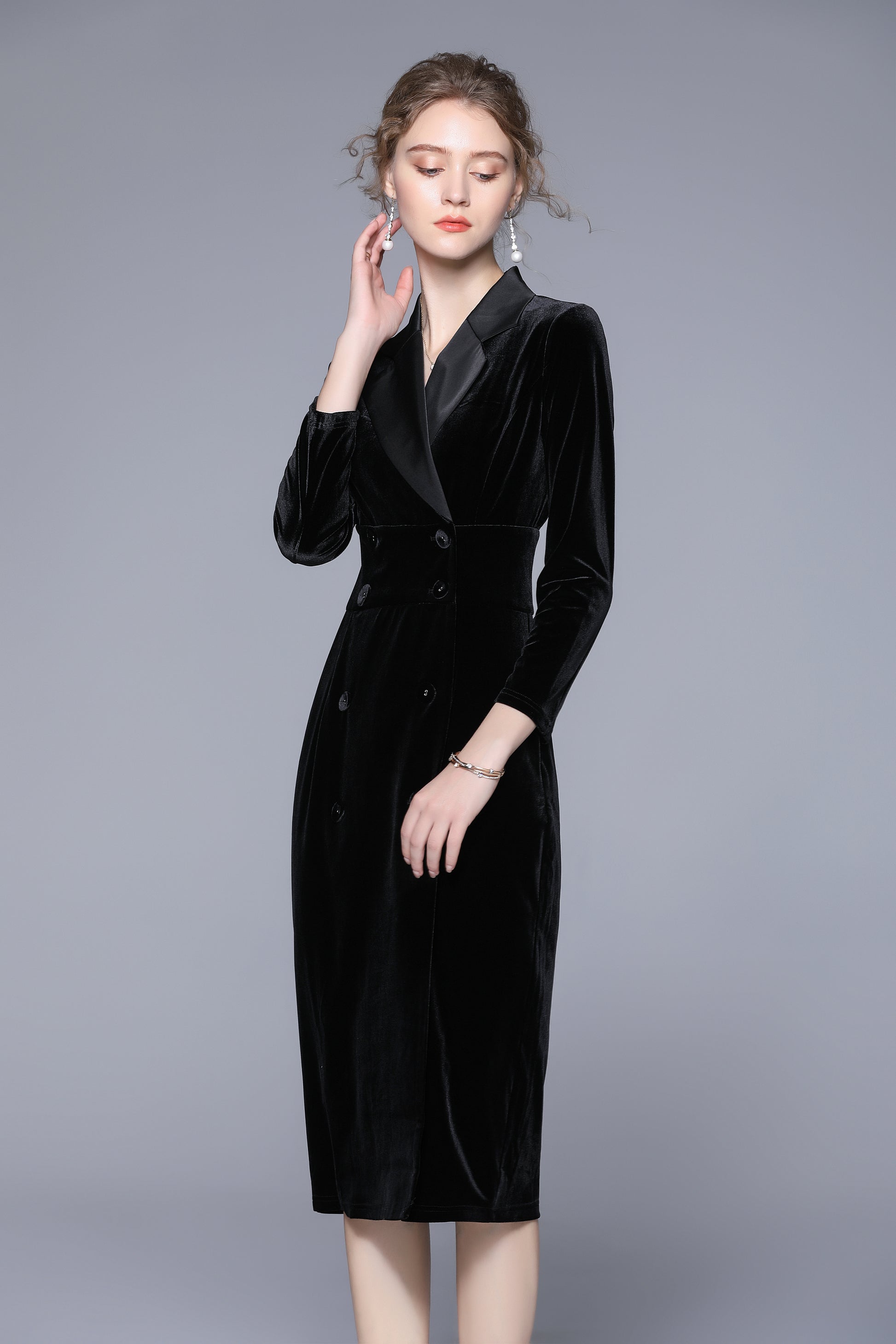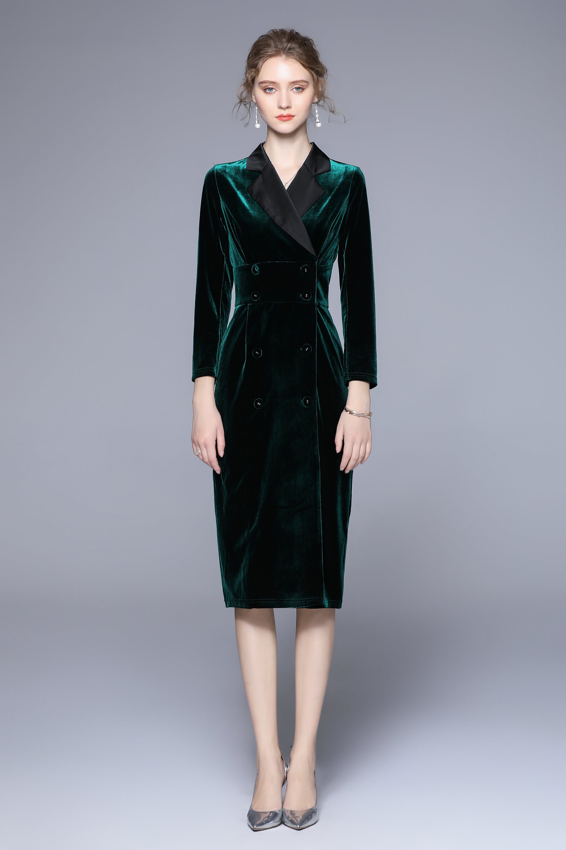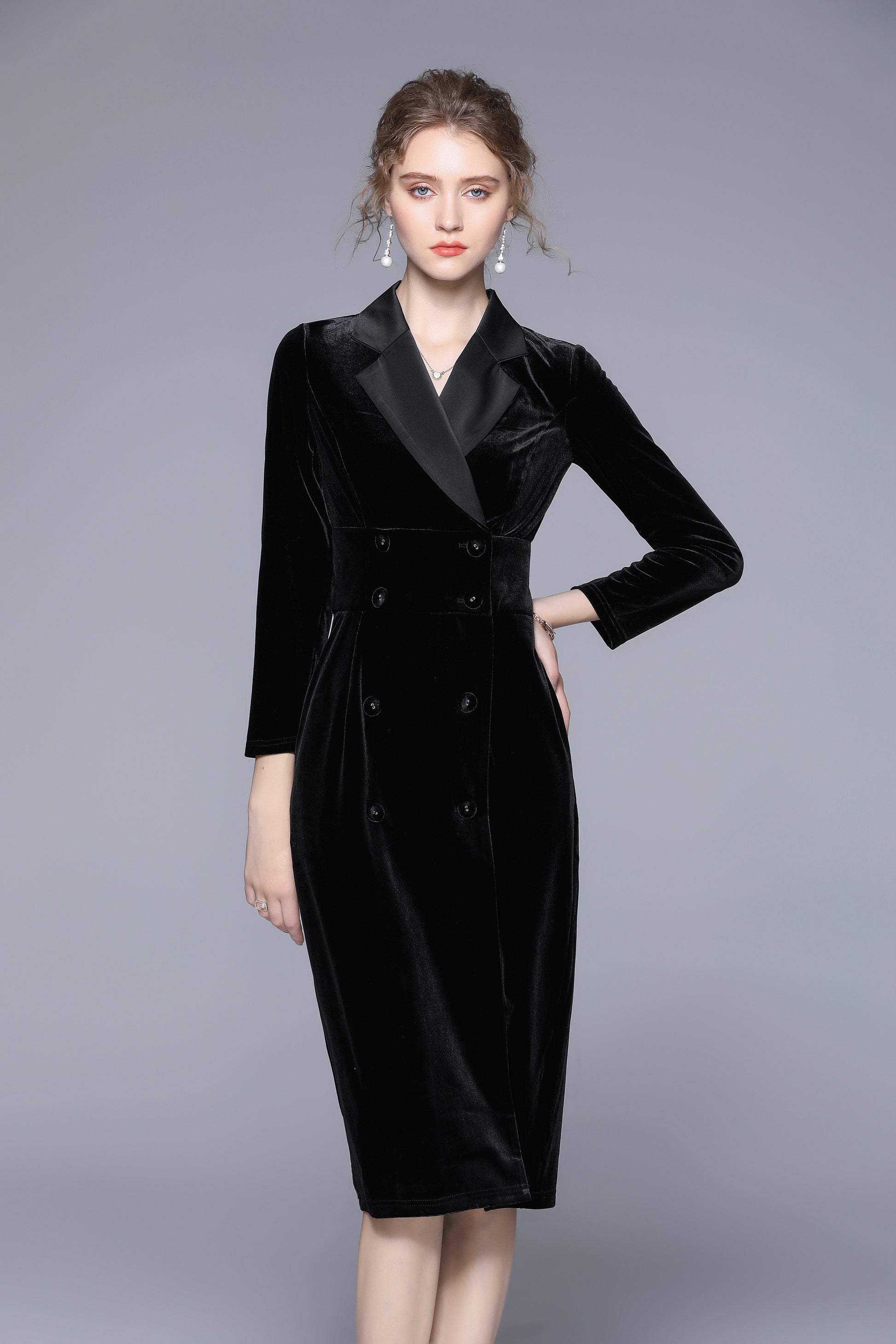 Double-breasted design: The classic double-breasted design adds a touch of formality and vintage to this midi dress, suitable for many occasions.