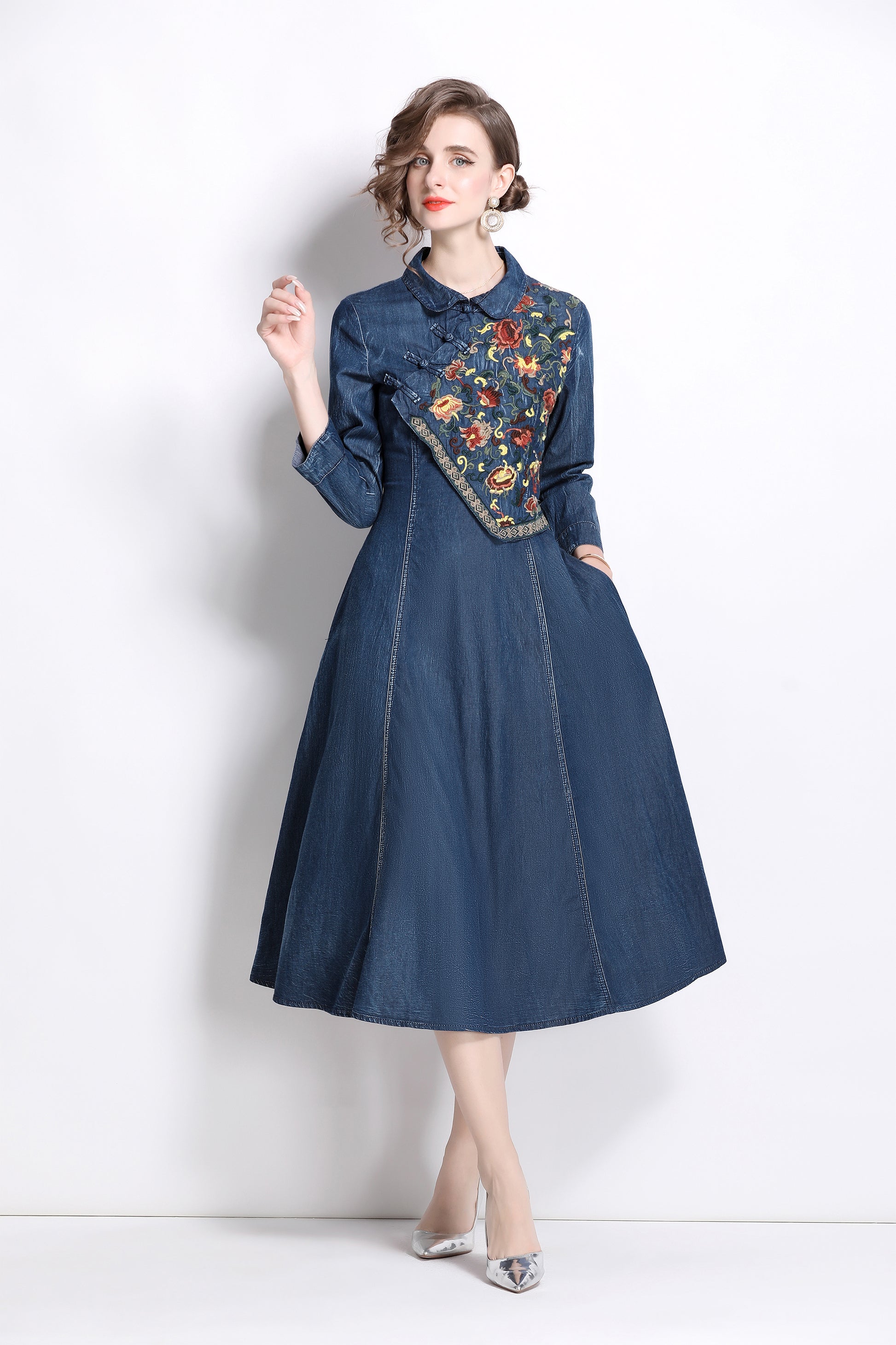 Women's vintage embroidered pocket denim midi dress