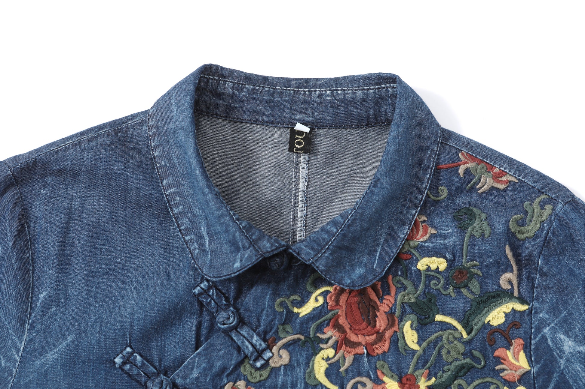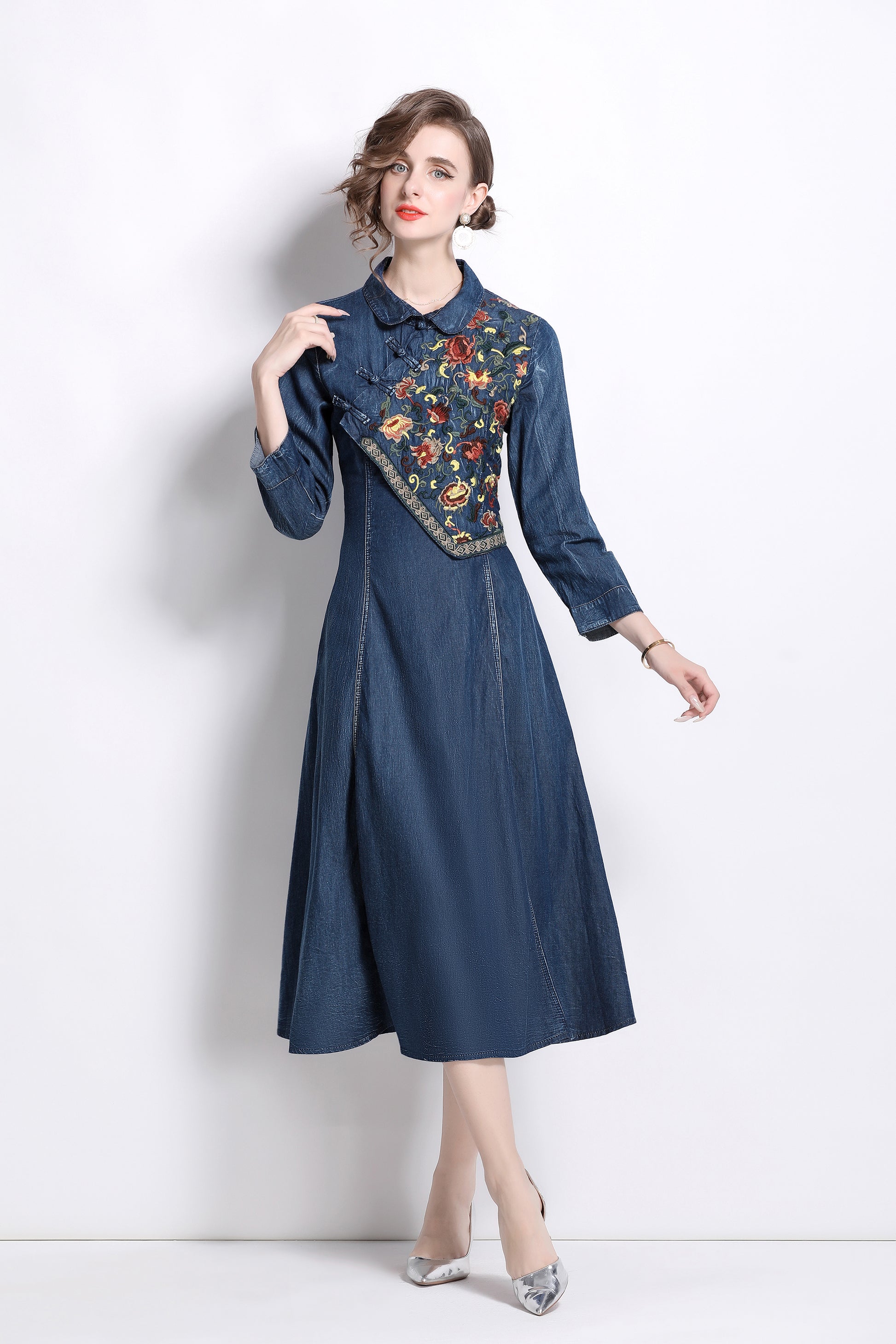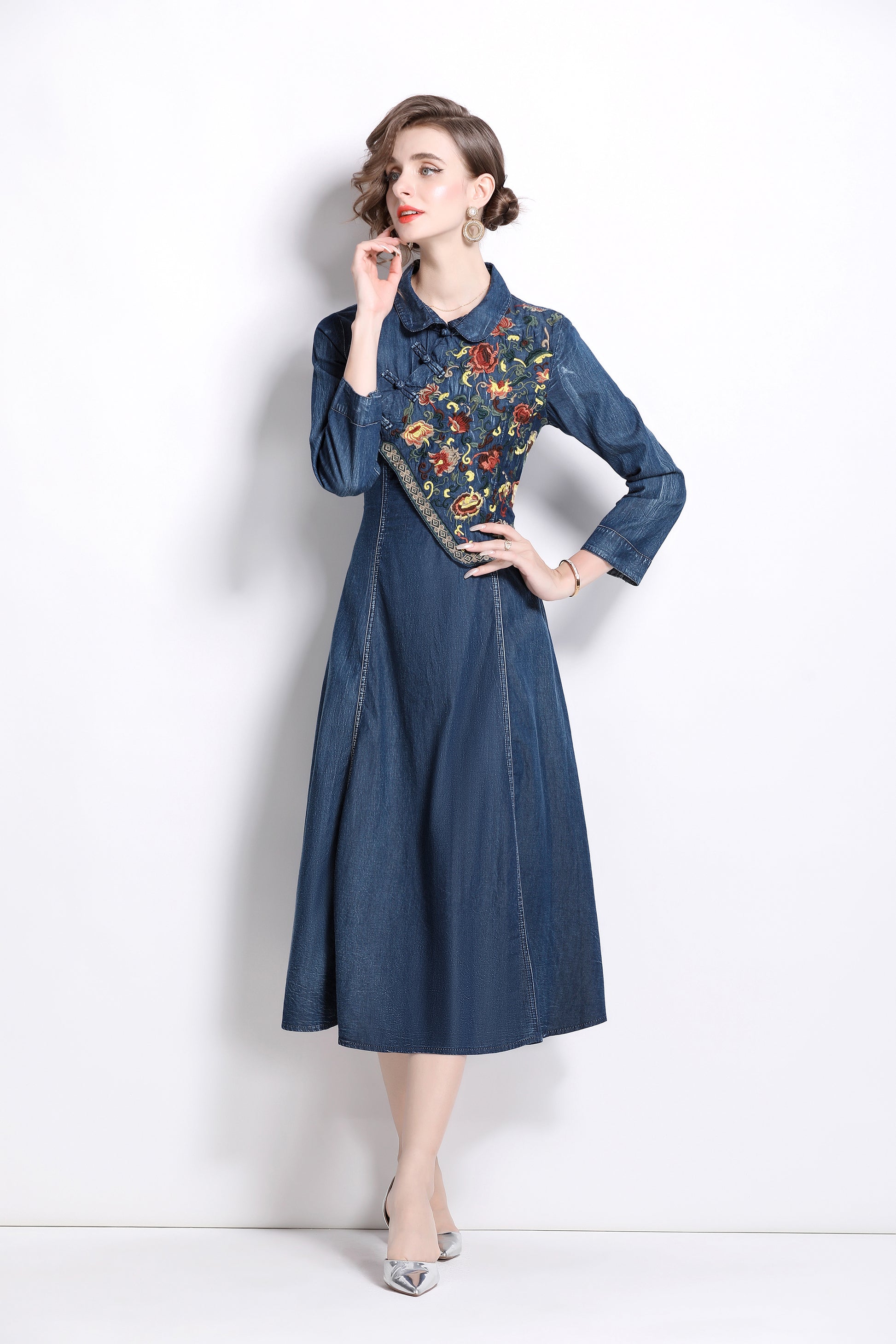 Style features: small lapel, A-line skirt version, side pockets, long sleeves, embroidered flowers, Chinese plate design, pleated hem, retains the most classic denim blue color, this color not only has A retro feeling, but also has the attributes of age reduction and youth, giving people vitality and vitality.