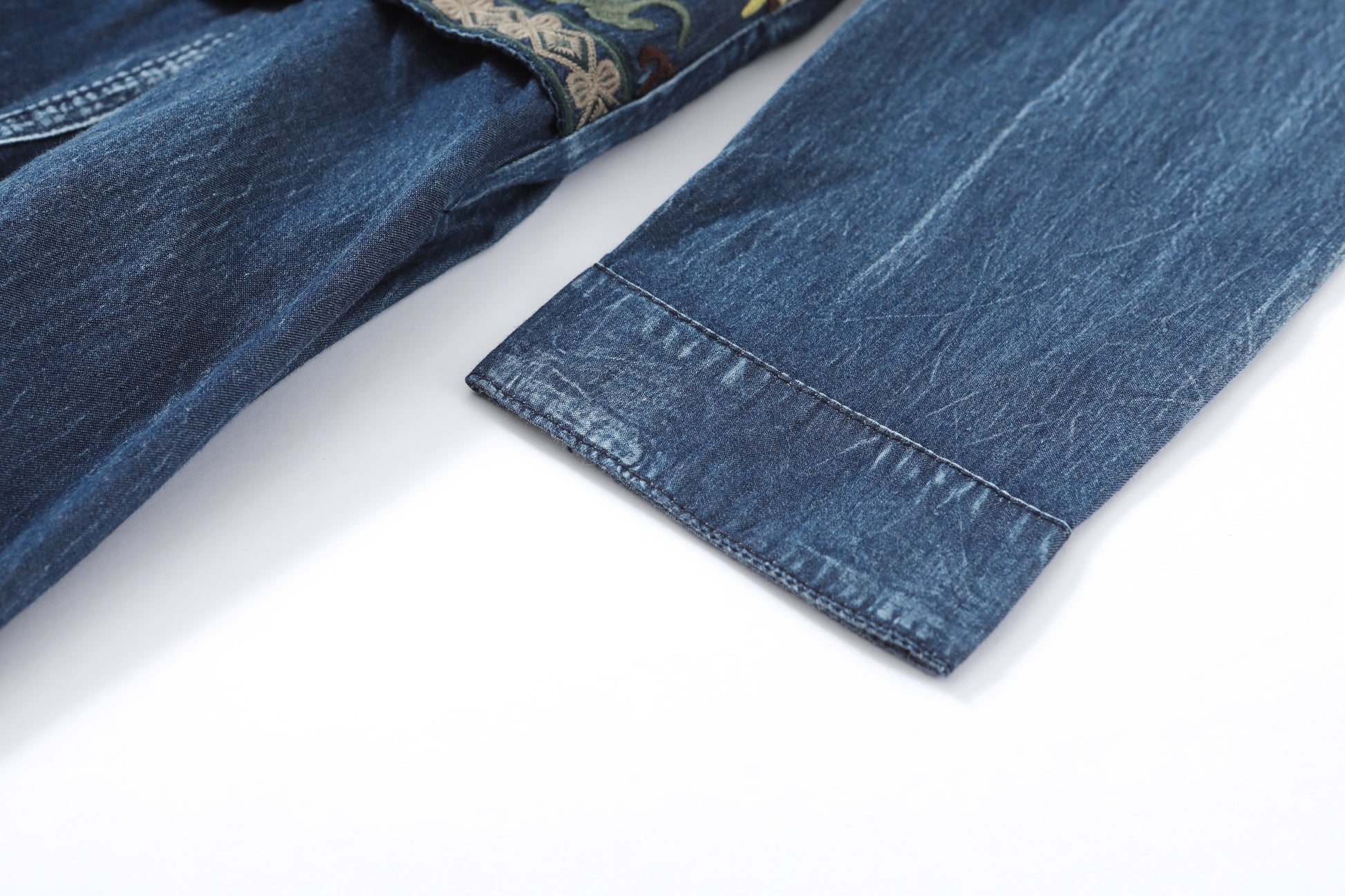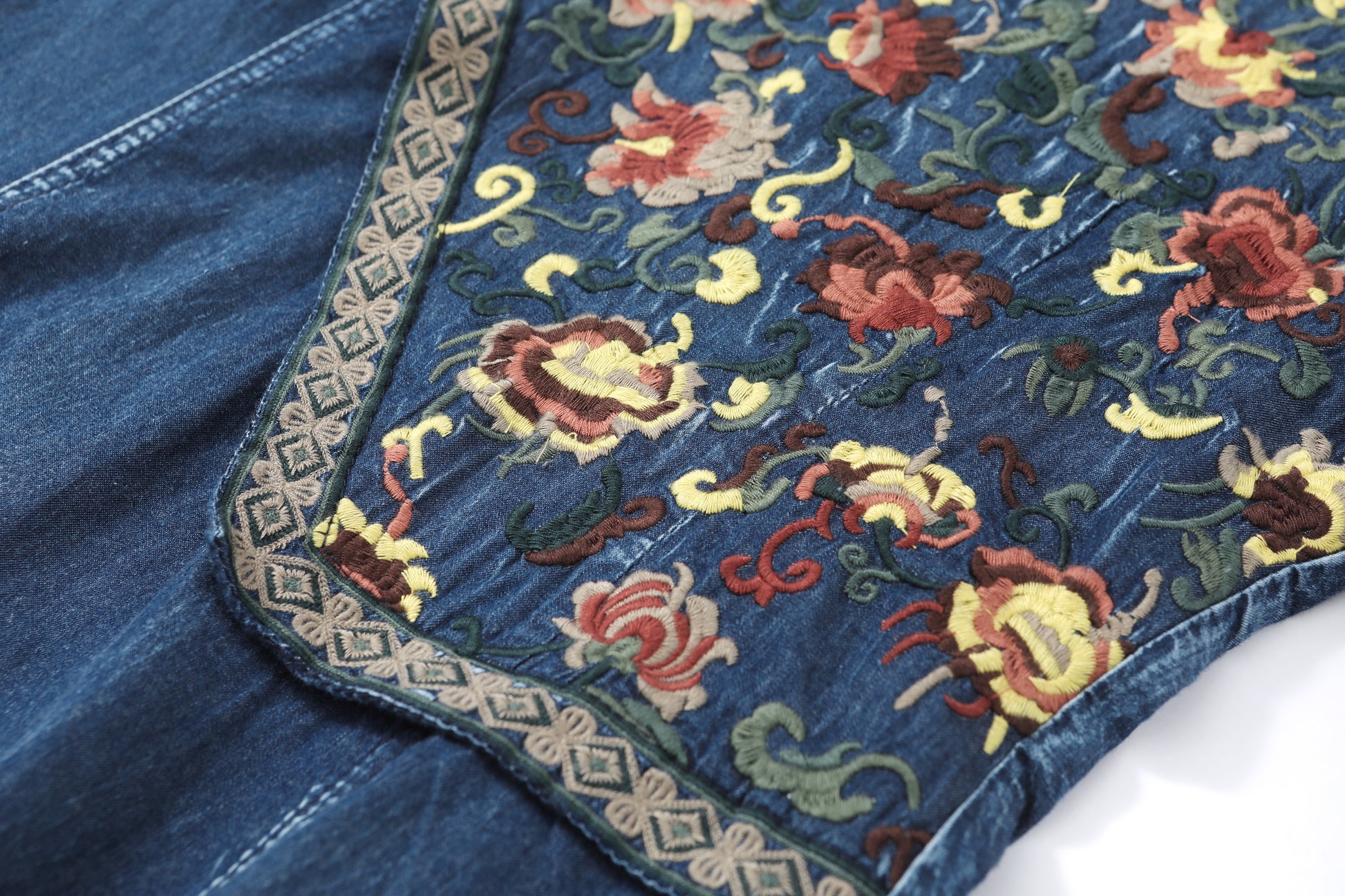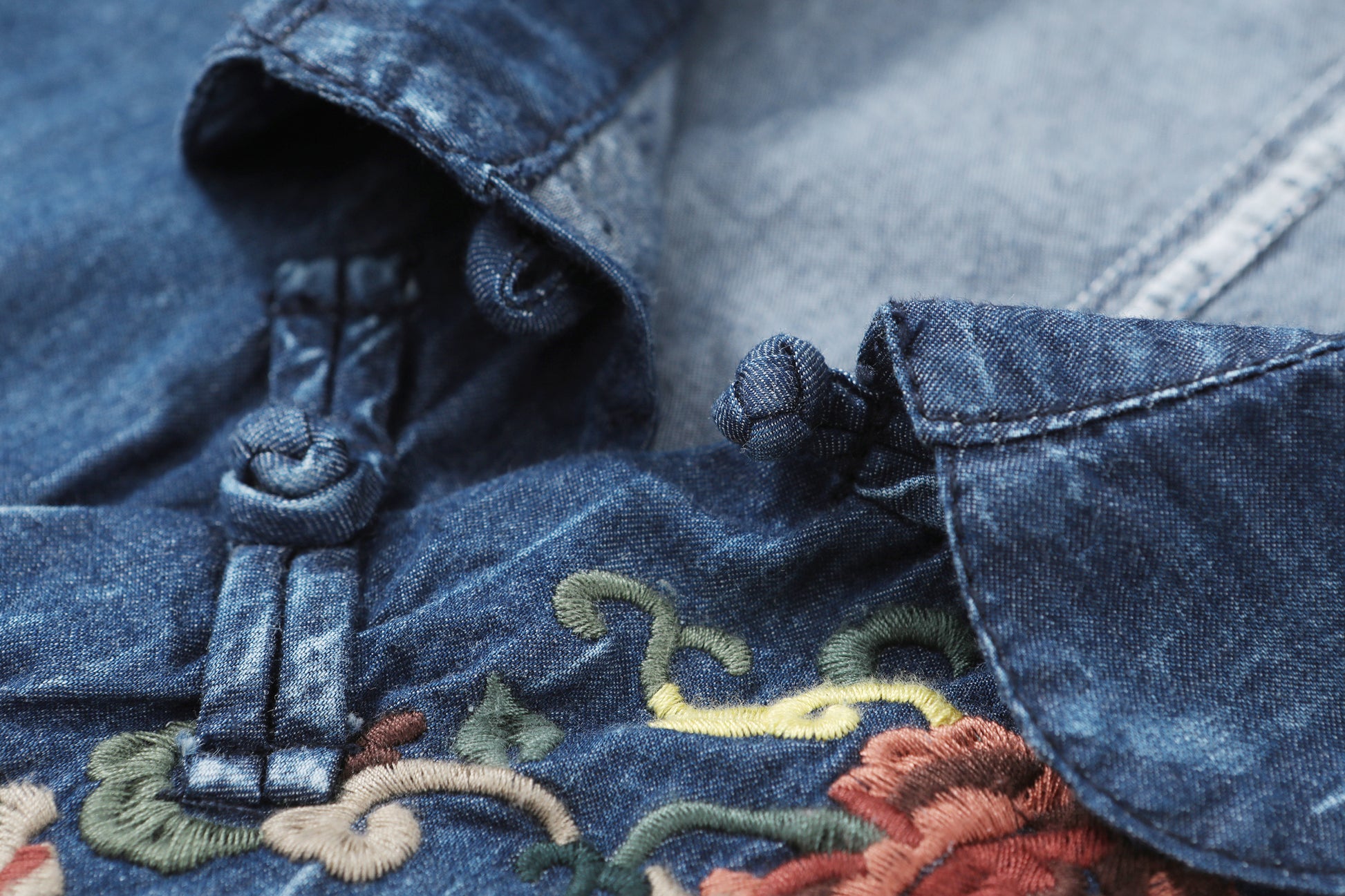 Style features: small lapel, A-line skirt version, side pockets, long sleeves, embroidered flowers, Chinese plate design, pleated hem, retains the most classic denim blue color, this color not only has A retro feeling, but also has the attributes of age reduction and youth, giving people vitality and vitality.