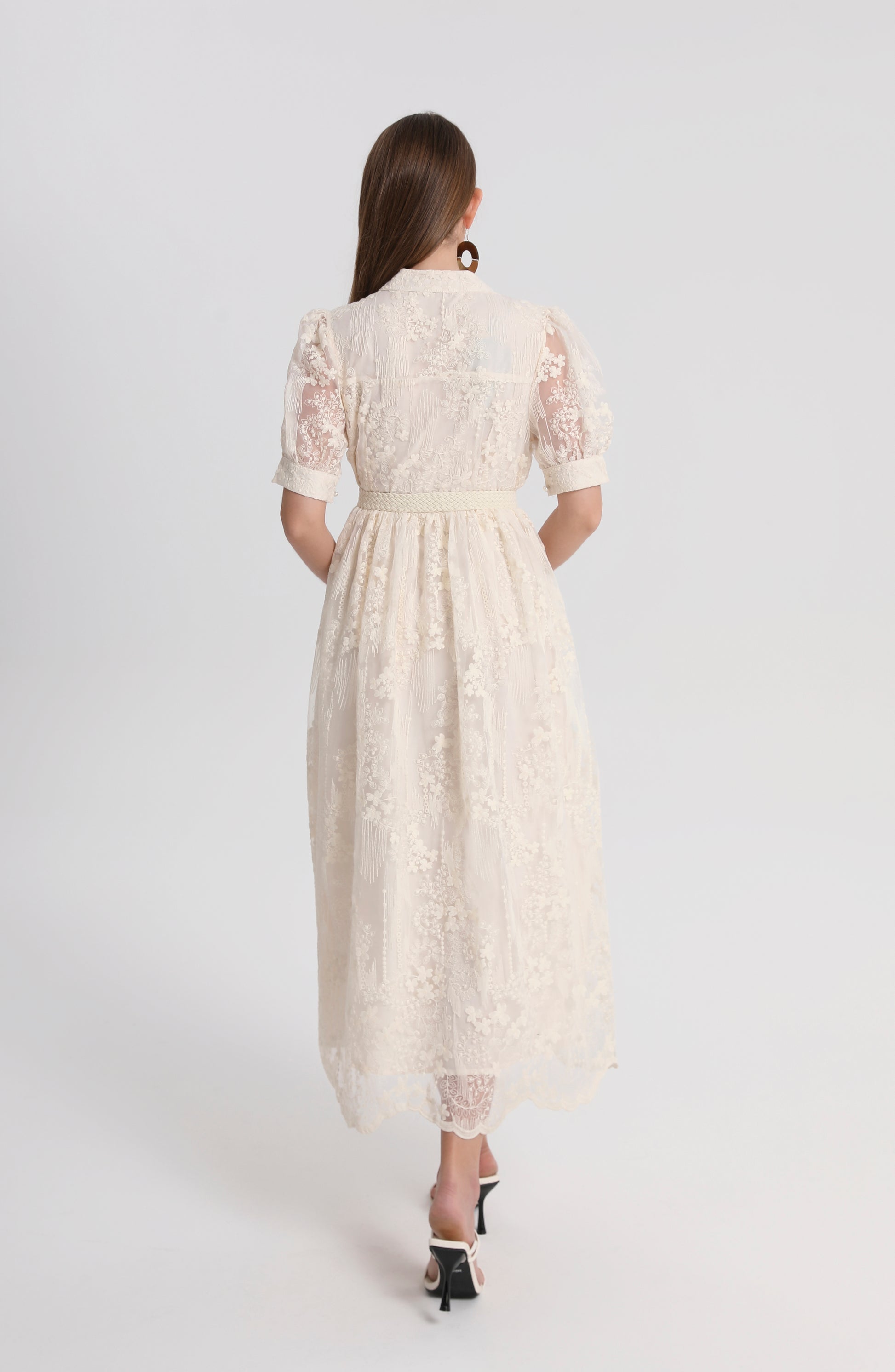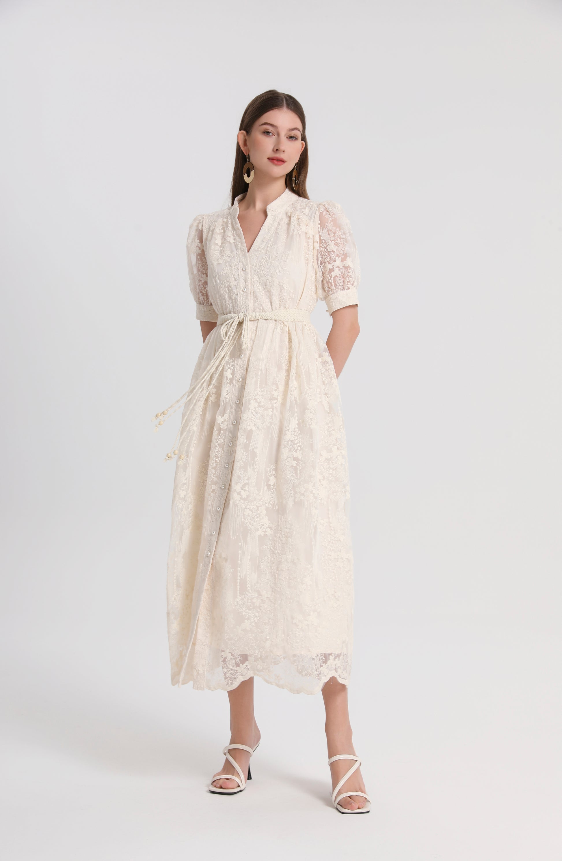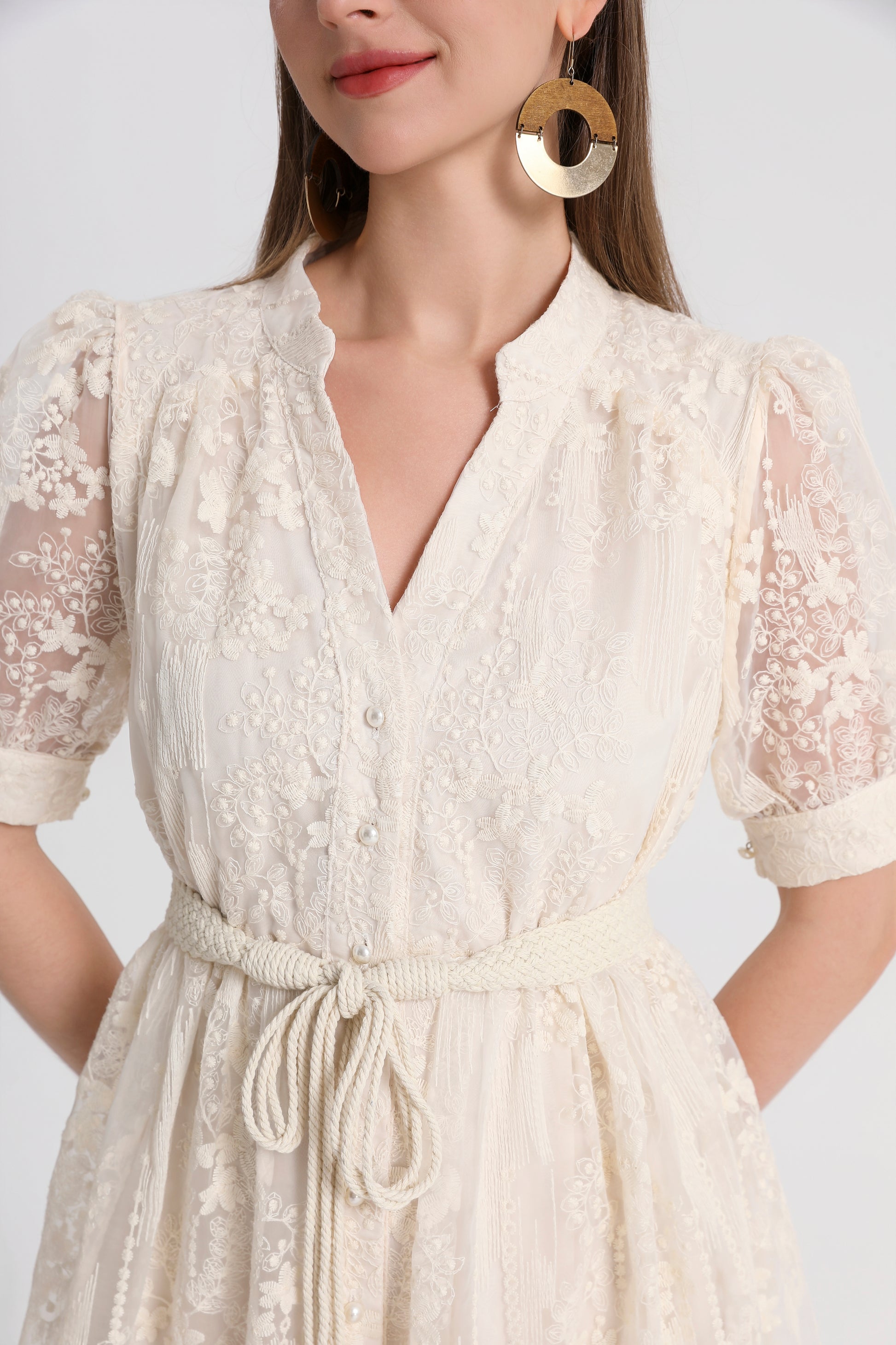 - Features:v-neck, short puff sleeves,button front, belt,mesh embroidery,midi dress;Made of high-quality lace fabric, it is light, breathable, soft to the touch and comfortable to wear.